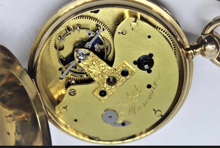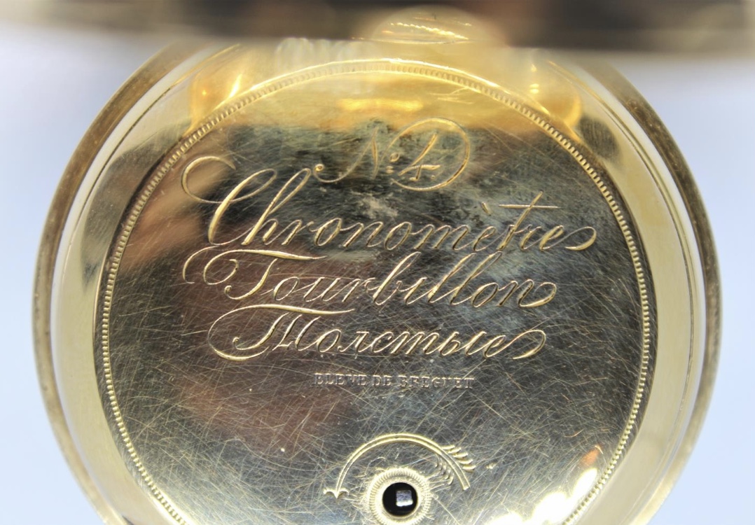 Подпись принадлежит мастеру из прославленной московской династии часовщиков – Толстых, основателем которой был Иван Васильевич Толстой, которого сравнивали с великим французским часовщиком Абрахамом Луи Бреге. Он первый в России делал карманные часы с турбийоном (устройство, уменьшающее земную гравитацию, что делает ход часов более точным), изобретением Бреге.