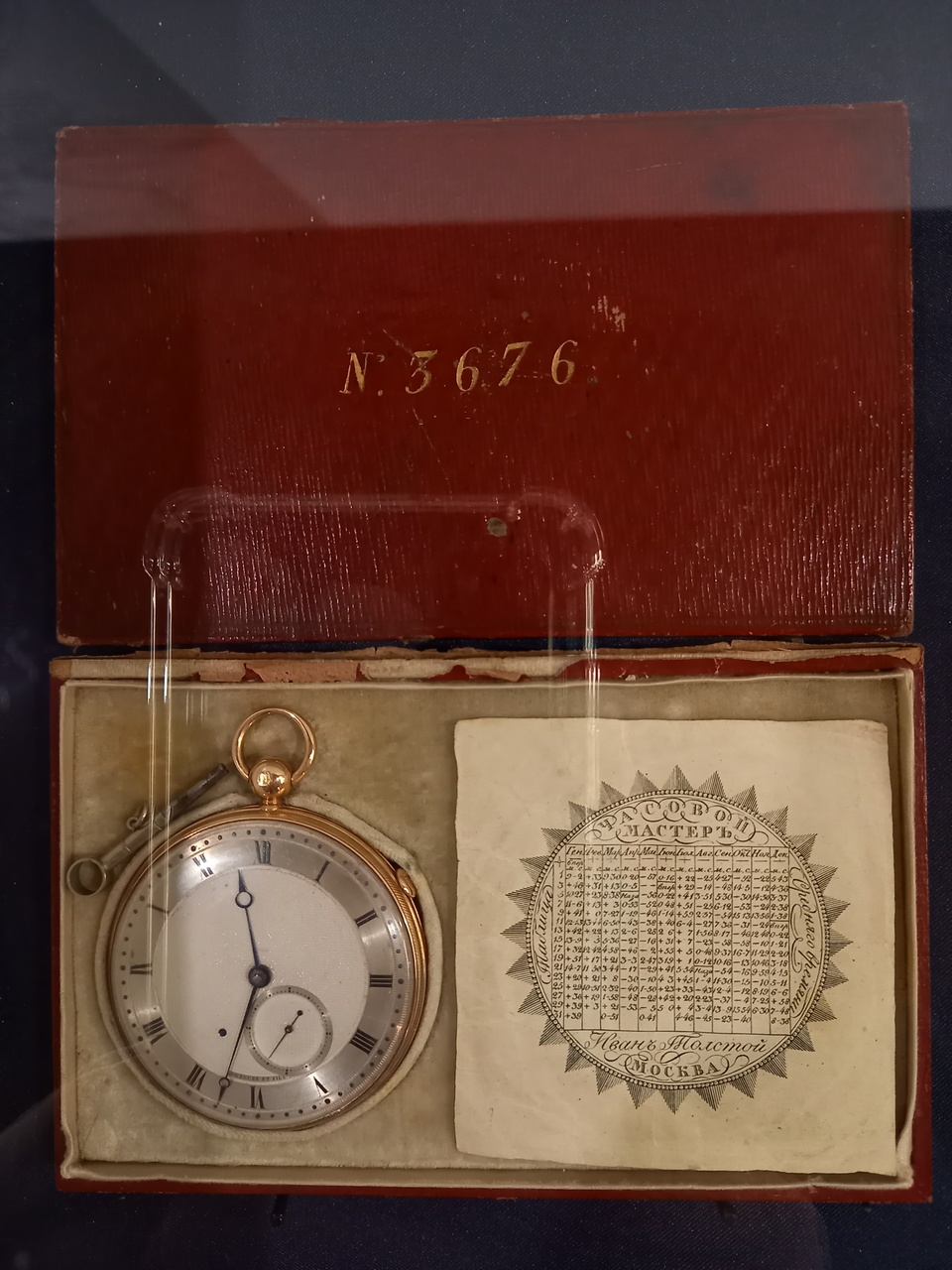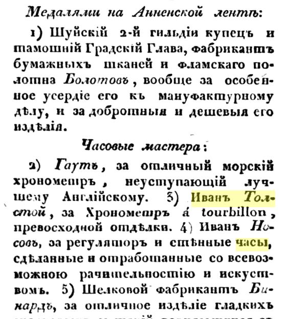 Часы-хронометр с турбийоном в золотом корпусе Иван Толстой представил на Всероссийской выставке 1829 года в Санкт-Петербурге, а Николай Толстой, кстати, на следующих выставках в Москве не раз выставлял свои карманные