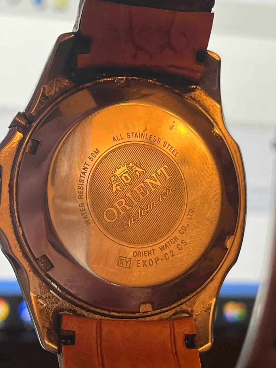 Циферблата такого я точно никогда не встречал (Ориент удивляет, да?), а вот задняя крышка вызывает вопросы.
