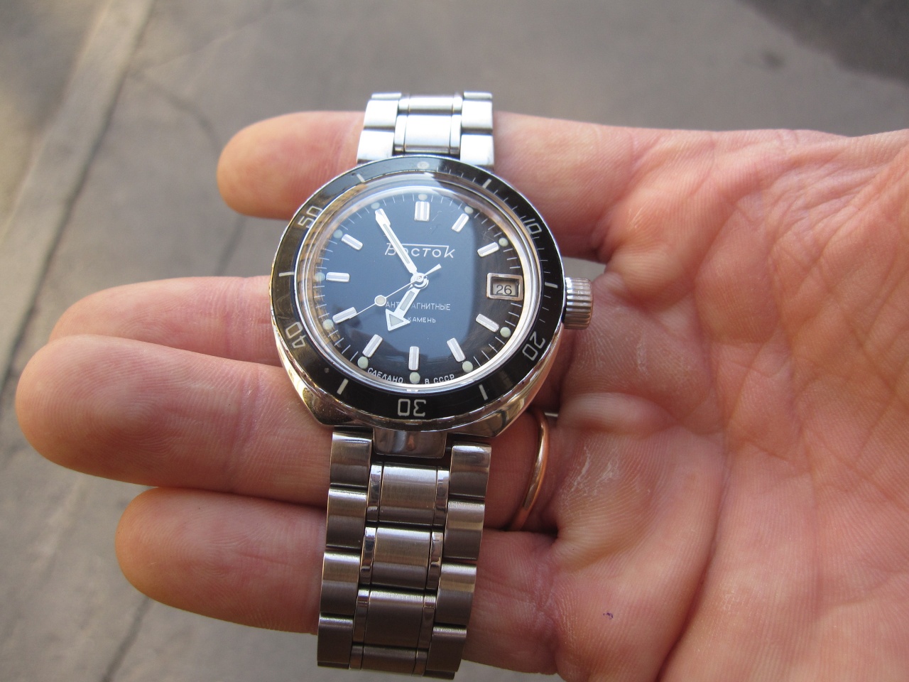 Теперь о секундной стрелке. Забавное ее поведение было замечено практически с момента покупки. При встряхивании часов она замирает примерно на 1 сек, потом может проскочить пару делений. Но самое интересное происходит с ней если взять часы в руки и расположить их вертикально (12 часов вверху, 6 часов внизу). В таком положении при движении стрелки сверху вниз она начинает проскакивать по 2-3 деления, иногда замирать. При движении вверх никаких аномалий не наблюдается. Консультировался по данному вопросу со специалистом - говорят нормальное явление, стрелка в этих часах "приставная и подпружиненная". Для меня, не специалиста, не очень понятно, ну да ладно, "приставная" так "приставная", главное чтоб на точность хода не влияла.