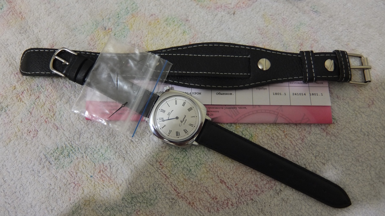 Напульсник (коричневая кожа для "Востока" и чёрная для "Мирного") и обычный 18мм черный кожаный.