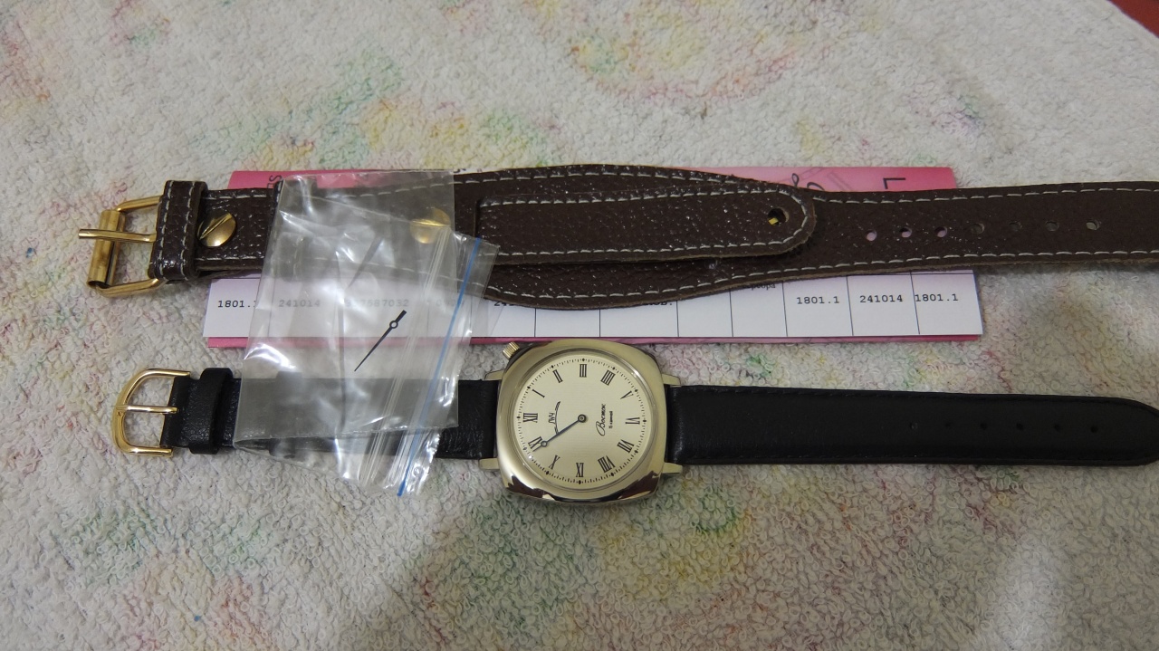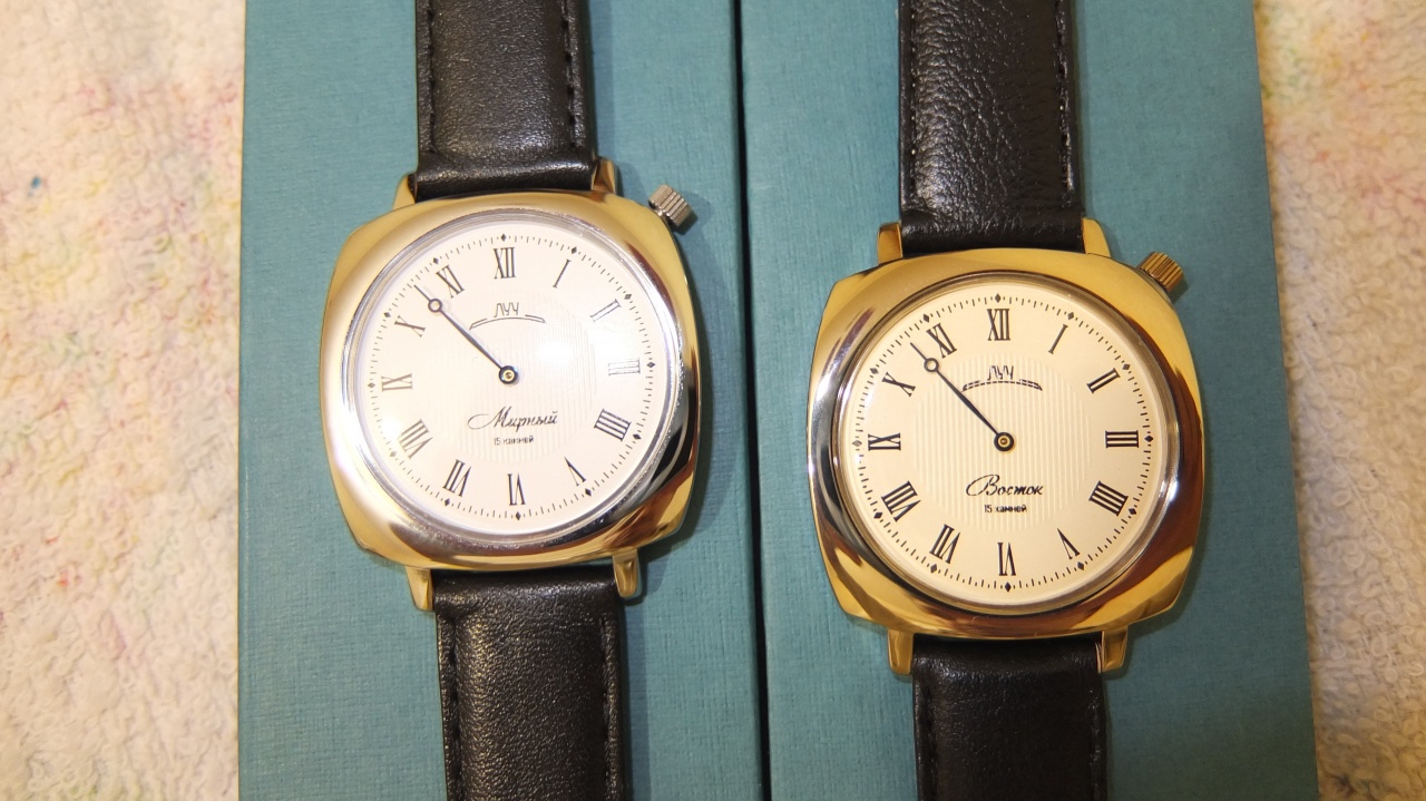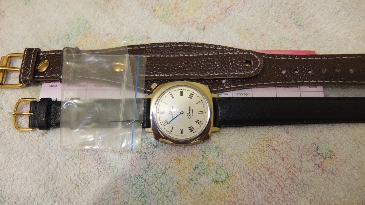 Напульсник (коричневая кожа для "Востока" и чёрная для "Мирного") и обычный 18мм черный кожаный.