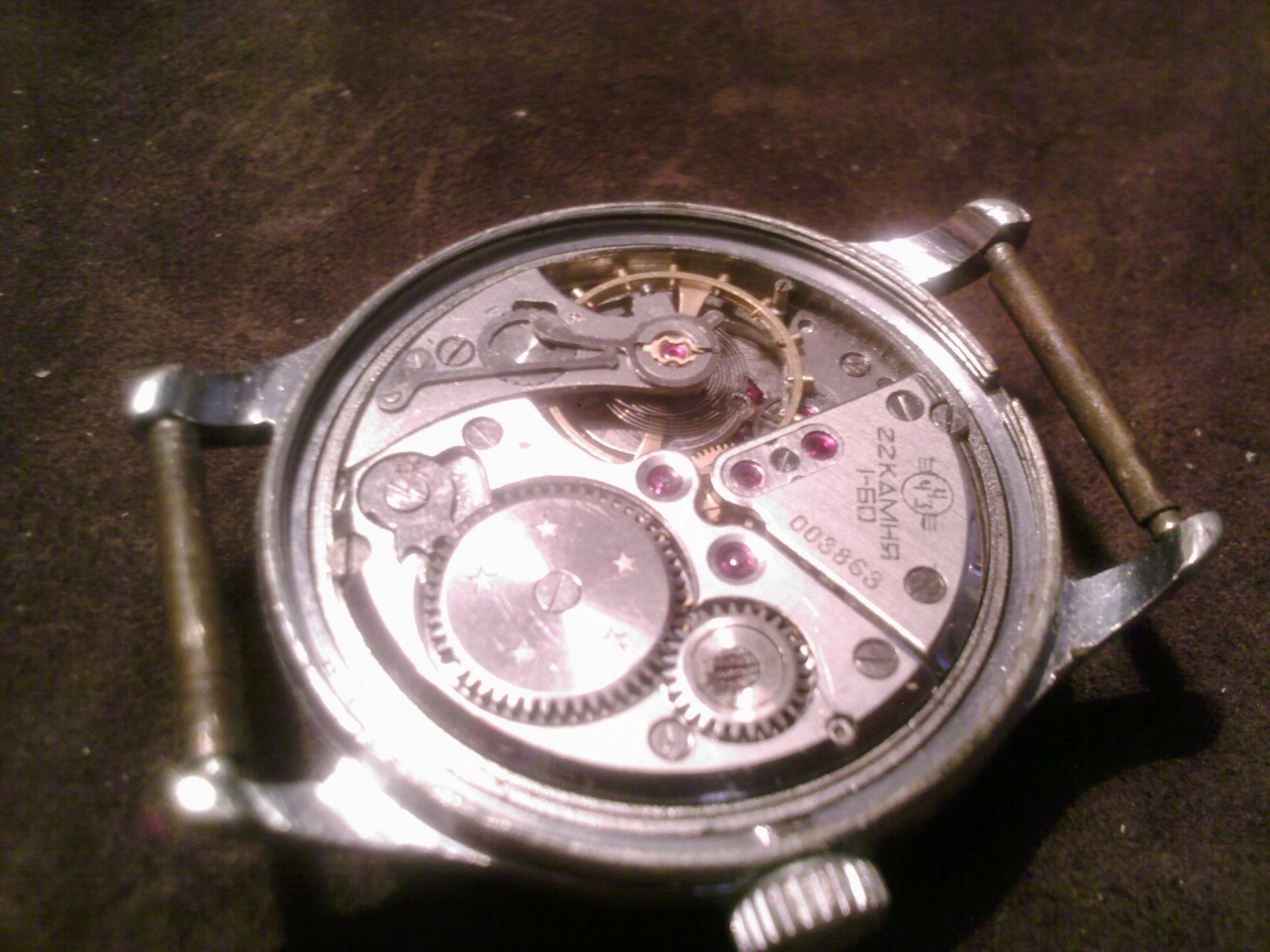 Часовой механизм 5НХ-1М диаметром 28 мм со стальным анкерным ходом на 21 рубиновом камне. Продолжительность хода от одной полной заводки пружины