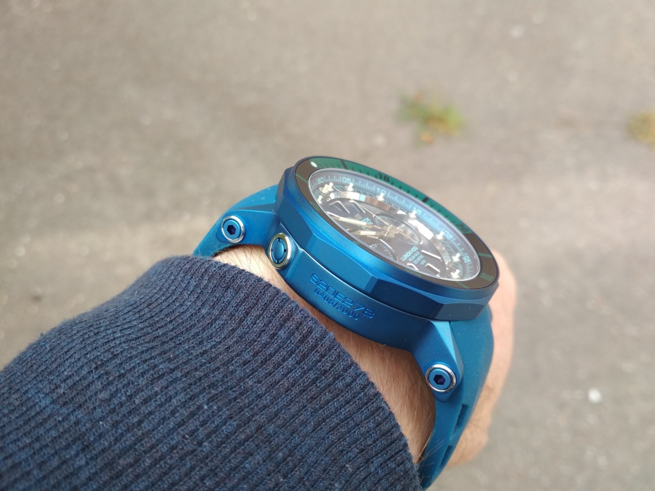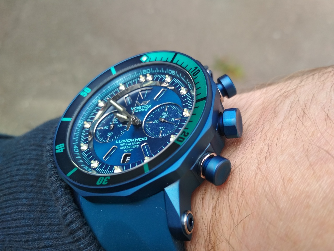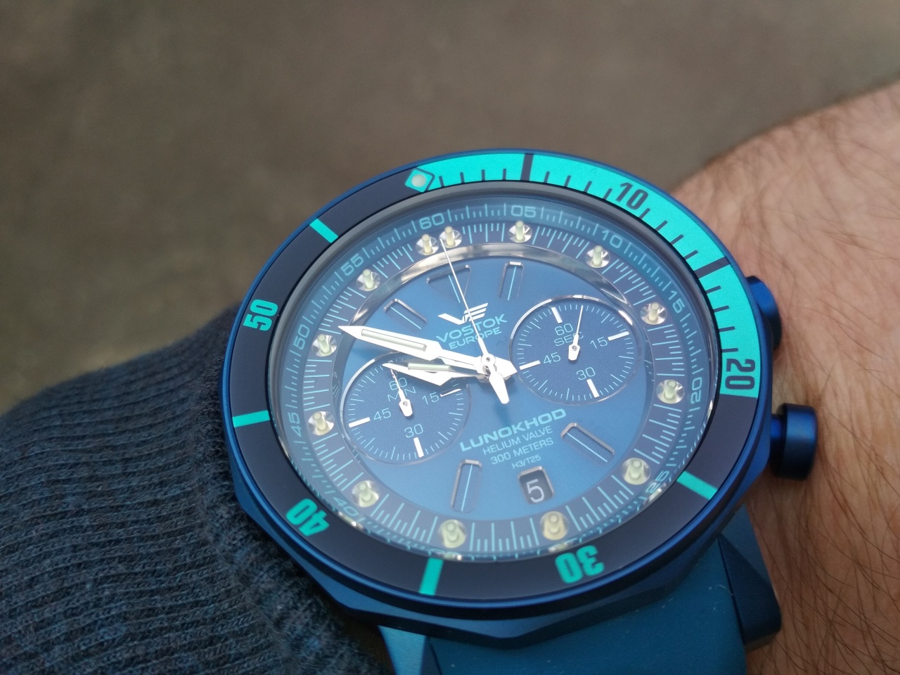 Вживую часы потрясающие. Матовое покрытие, голубой же циферблат с переливами и сверкающие акценты из хрома - стрелки, кольцо, винты. Просто шик. Безель ходит легче, чем на Энергии, и щелкает звонче, приятнее. Ну и посадка чуть другая на руке, луноход сидит как влитой, и, в отличие от Энергии, на кожу ставить его совершенно неохота.