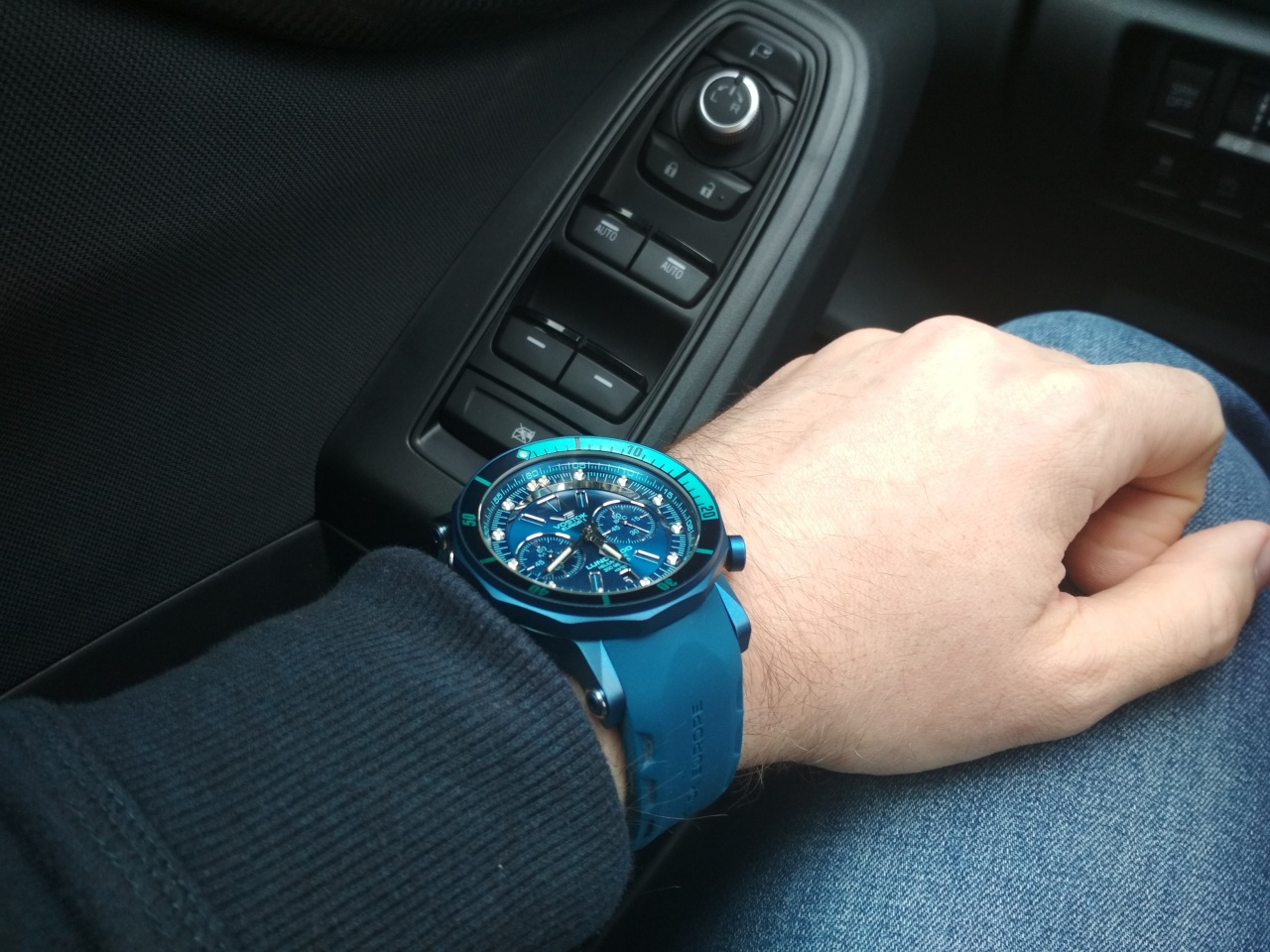 Спасибо. Ещё пару слов скажу об этой паре часов. Они очень разные по восприятию, хотя стилистике общей конечно понятно, что их одна контора делала. Синий Луноход имеет очень "чистый" вид, благодаря идеальном покрытию и тончайшим хромированным элементам, таким, как кольца вокруг малых циферблатов и центральной стрелке хронометра, которая напоминает сверкающую иглу шприца. Синий хрон читается проще, чем Энергия. Если бы не покрытие, то вполне подошёл бы как часы на каждый день. Думаю, с царапинами он резко потеряет в харизме. Хорошо сочетается с джинсами и любой белой или голубой/синей одеждой, а такой у меня много.