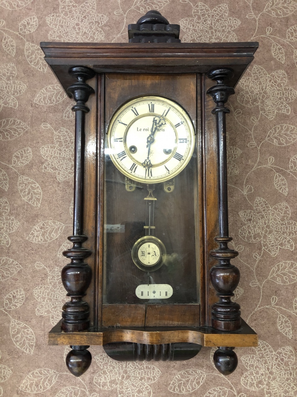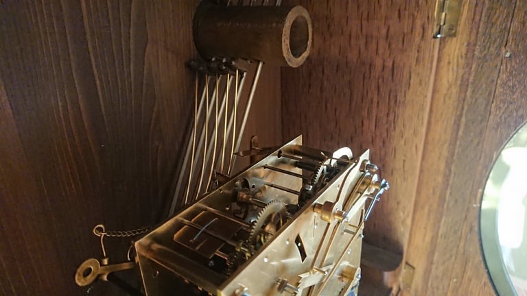 После двух дней работы часы пошли и забили более-менее нормально. Но сильно отставали, резьбы на стержне маятника не хватало, пришлось подобрать подходящую втулку под гайку, длиной миллиметров 15 (до меня там в качестве втулки стояла гайка от каких-то других часов, но и её длины не хватало). Допускаю, что маятник «неродной».