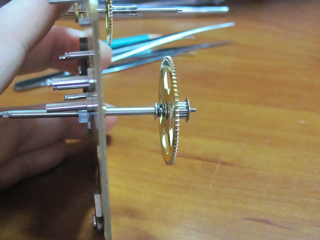 1. Механизм хода - жильник с двумя параллельно работающими гирями, а механизмы боя - пружинные. Оси пружинных барабанов вынимающиеся, почти как в ранних ОЧЗ, только крепятся они стопорными шайбами на задней платине.