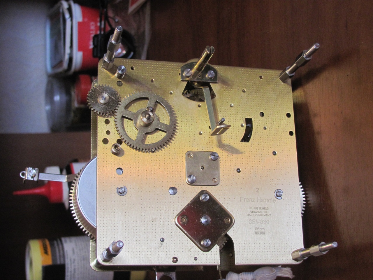 3. Механизм четвертного боя с игральным валом расположен не сзади, а сбоку от основного механизма. Очевидно, для уменьшения глубины корпуса. Одни и те же молоточки и струны используются и для четвертного, и для часового боя - до этого я такое решение видел только в каминных часах. В приводе к молоточкам от механизма часового боя присутствует горизонтальная тяга, работающая на сжатие. Её шарниры необходимо смазывать густой смазкой, иначе она препротивно дребезжит. По-хорошему, надо бы добавить туда пружинку, выбирающую зазоры. Молоточки сделаны не из проволоки, а отштампованы из листа, гнутся очень тяжело. Бойки молоточков пластмассовые.