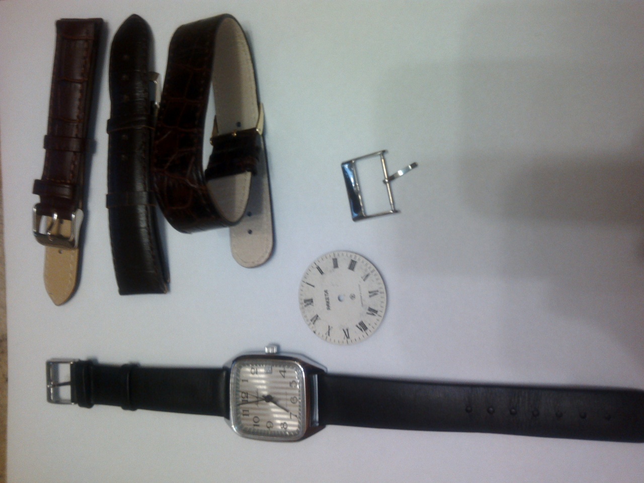 2.Наручгые часы (римские цифры, синий циферблат, бочкообразной формы).