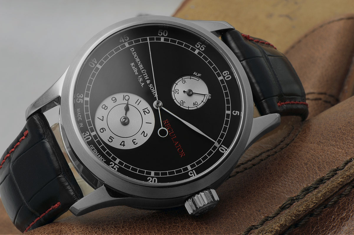 Механизм Unitas является базовым для Cal.99.1 от Dornbluth&Sohn, но всего два узла не подверглись дополнительной обработке – зубчатая передача и анкерный спуск. Cal.99.1 - это пример одной из наиболее основательной переработки распространенного базового калибра, с долей ручного труда большей, чем Вы можете найти в часах крупных брендов. Дизайн циферблата и стрелок навеян дизайном карманных морских хронометров 1940-х, например, аналогичный дизайну Lange&Sohne. Дирк Дорнблют (Dirk Dornbluth) из г.Кальбе, земля Саксония-Анхальт, основатель семейного бизнеса носящего его фамилию, чувствует себя обязанным продолжать эту прекрасную традицию.