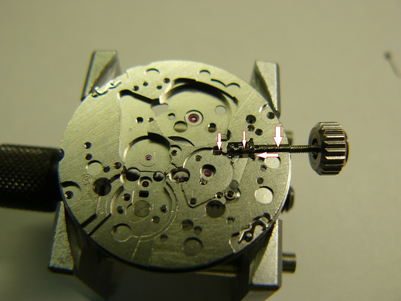 устанавливаем заводной вал, триб и кулачковую муфту, смазываем в нужных местах