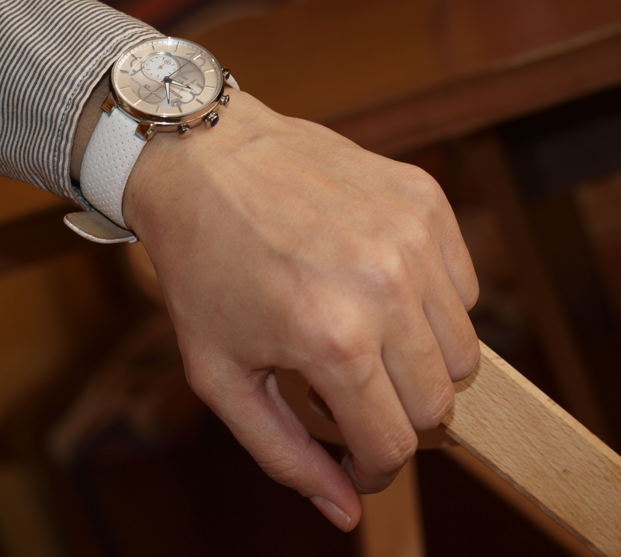 Часы: универсальные !!!! (ну, разве что как вечерние не пойдут) Боялась,что будут бросаться в глаза, нет, скорее даже скромные. С ремешком придется позаморачиваться, красится быстро от одежды (пришлось пожертвовать браслетом в угоду цвету). Не самая выраженная читабельность, но напрягаться, чтобы рассмотреть, не приходится. Размер средний, на моей руке (16 см.) большими не смотрятся, скорее наоборот.