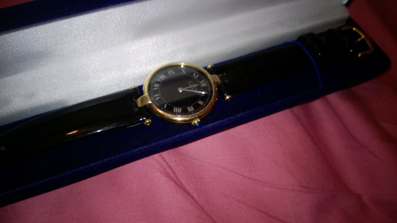 Неувядающая классика от Картье. Серебро 925 пробы, с позолотой слоем в 20 микрон. Сапфир кабошон в заводной головке. Очень красивое и редкое исполнение - циферблат черного цвета с римскими цифрами золотого цвета, наиболее читабельное цветовое сочетание.