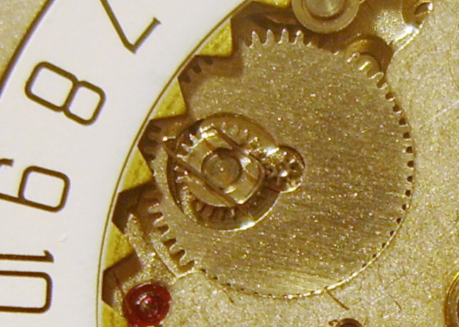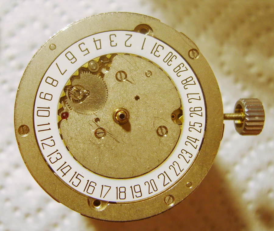 Снимков меха Полет 3105 с циферблатной стороны я, кажется, еще не выкладывал в этой теме. Вот он, мой пока что бездомный красавец родом из СССР. На втором снимке видно ту самую планетарную шестерню, от правильного позиционирования которой зависит правильная работа календарной системы и возможность быстрой коррекции даты: