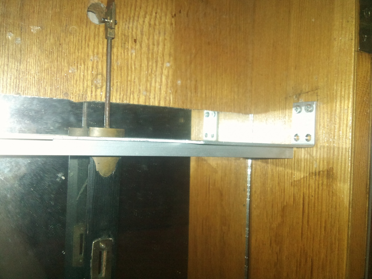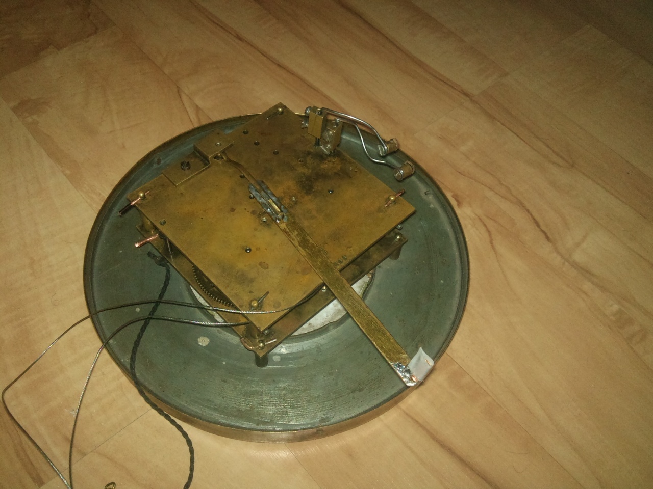 С боем было тоже непросто. На механизме был вал, на который должен был быть прикреплен молоточек. Знакомый уже теперь часовщик подарил спиральный однониточный гонг. Молоточек был изготовлен из латунной втулки с резьбой, кусочка кожи и куска проволоки. Соединялся молоточек с валом электрической клеммой с винтами. Часы начали бить, но звук был как из бочки. А через пару лет кто-то подарил 4-хстержневой гонг. Появилась идея сделать бой типа "бим-бом", для этого в механизме было просверлено еще два отверстия, и установлена вторая ось и второй молоточек.