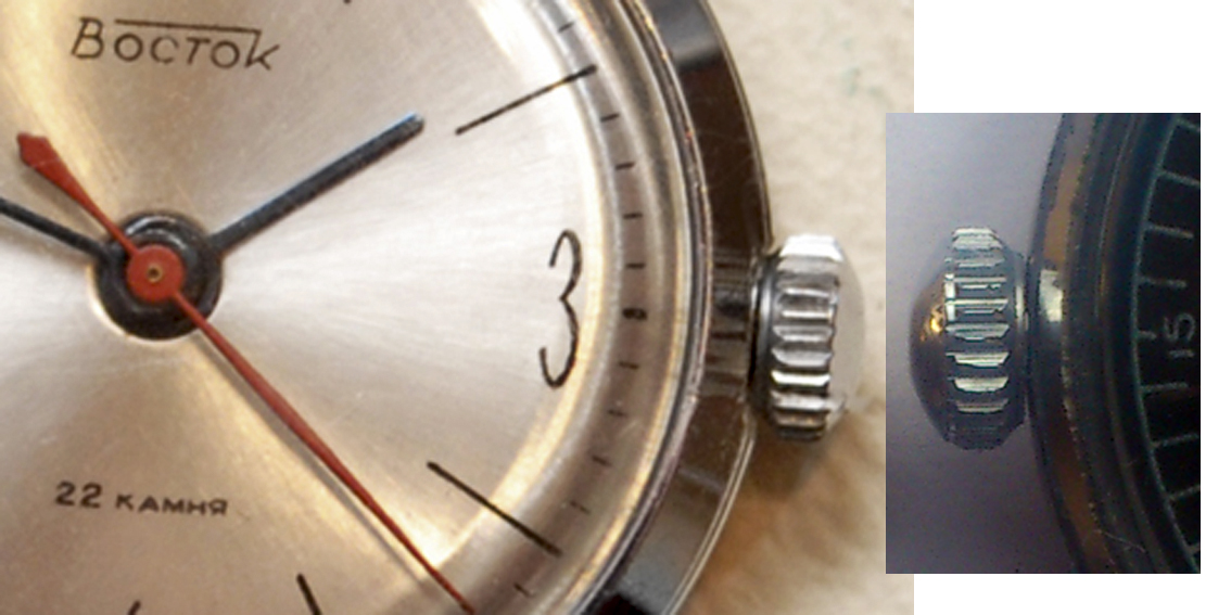 2. Головки на часах 26 и 28 калибров во времени немного разные по геометрии, но все равно это востоковские головки и сильно отличаются от полетовских.