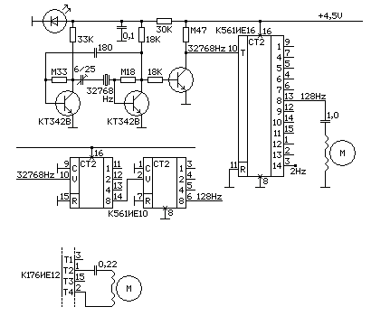 Часы, понятное дело, работают только с одной нижней катушкой, если завернуть чуток ее сердечник, чтобы увеличить ход камертона. При этом завышен потебляемый схемой ток. Впаял вместо верхней катушки резистор 470 ом - не хватает амплитуды камертона.