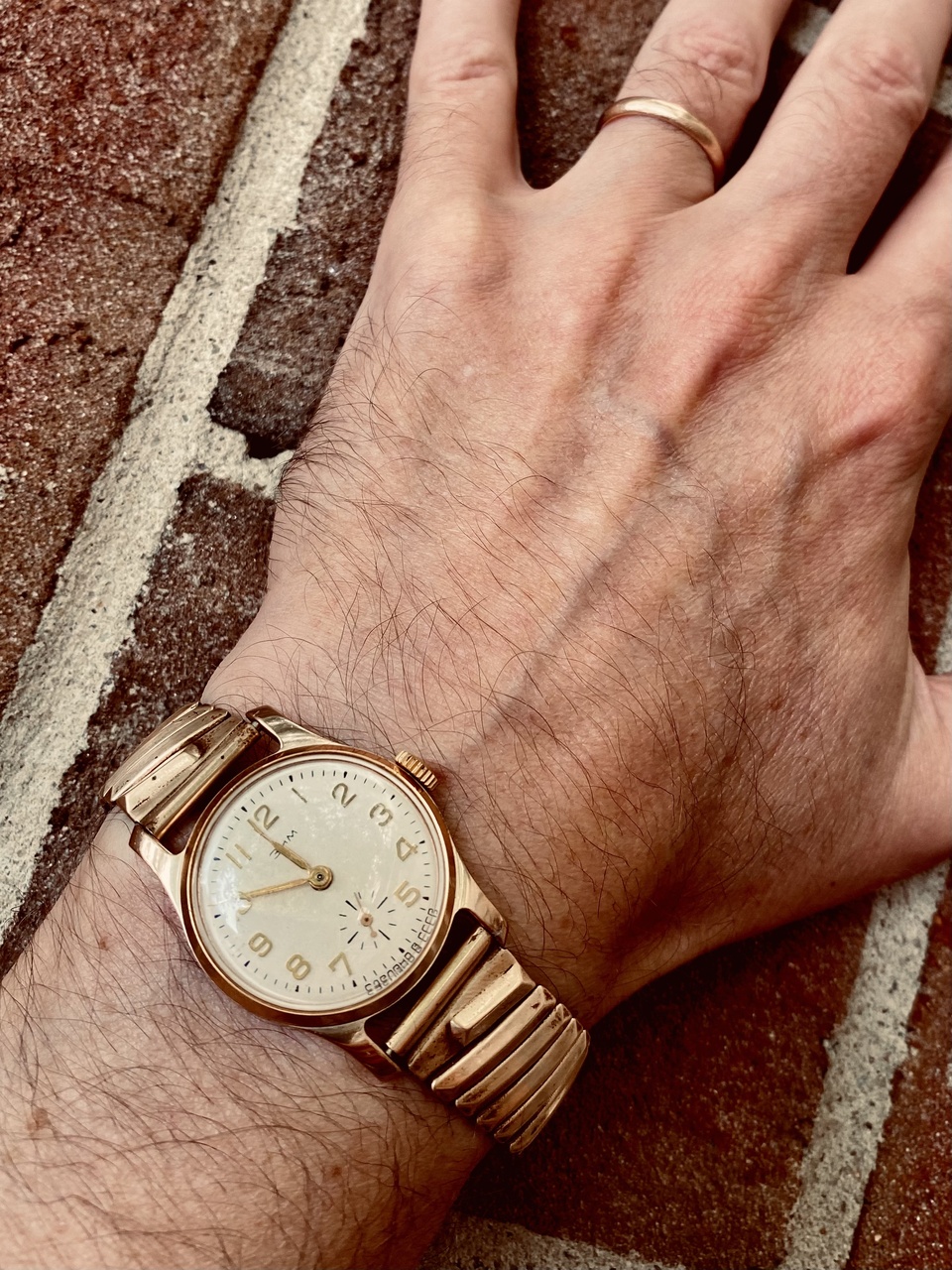 Все про часы да про часы. А я про браслет! Надеюсь тапками не забросаете. Браслет резинка производства Ленинградской ювелирной фабрики. Мой из 1966 года. Герои ‘Шурика’ очень жаловали этот браслет. Ну и Гагаринская родина была продана на таком. Купил на Зиме даже не подозревая что это советский браслет. Фото браслета отдельно: до чистки. На руке это уже не много приведенный в порядок.