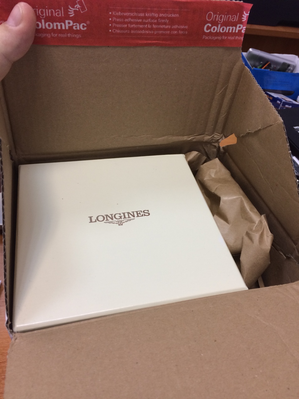 Белая картонная коробка, не очень жесткая. Размером чуть более коробки часов и по этому скомканную оберточную бумагу для смягчения путешествия у них получилось засунуть лишь с одной стороны и эта сторона сильно помята по углам, значит по всем остальным сторонам за сохранность часов спасибо лишь коробке с самими часами, ведь она приняла все удары судьбы на себя