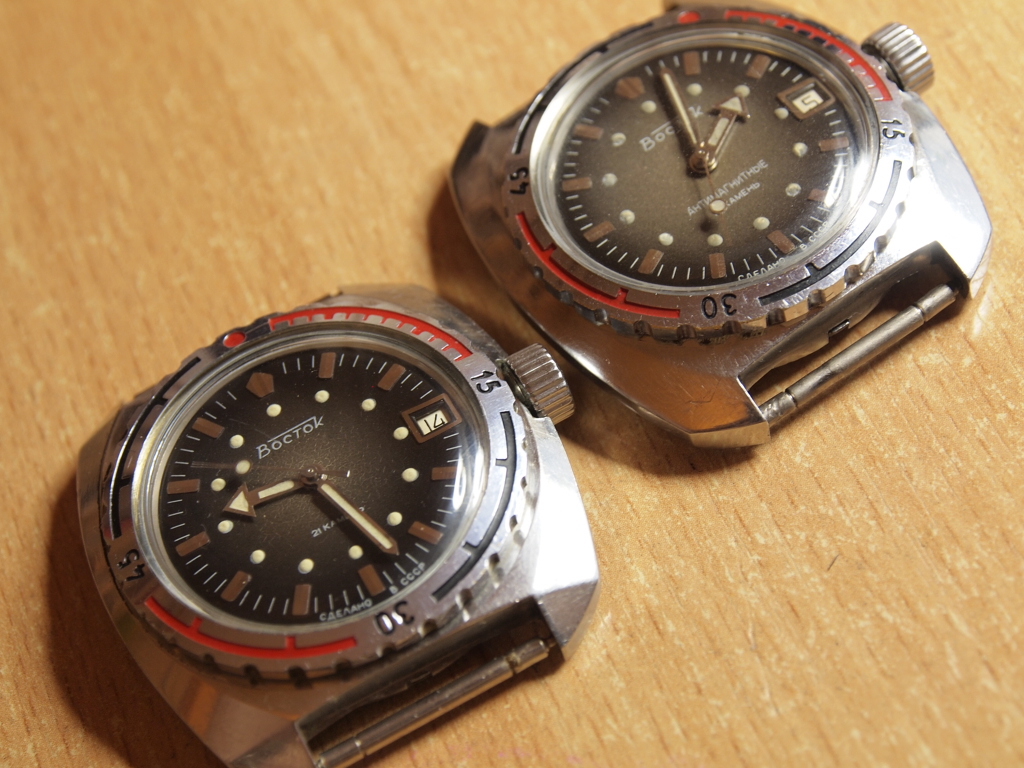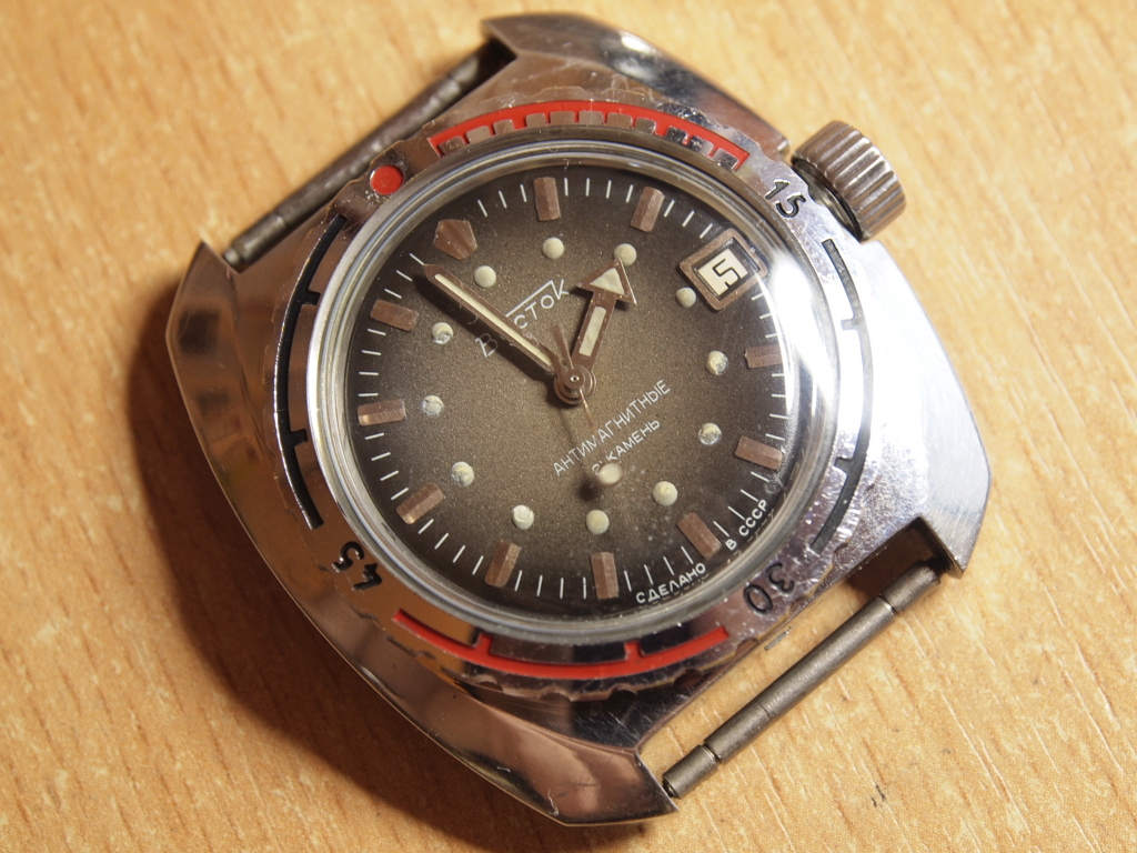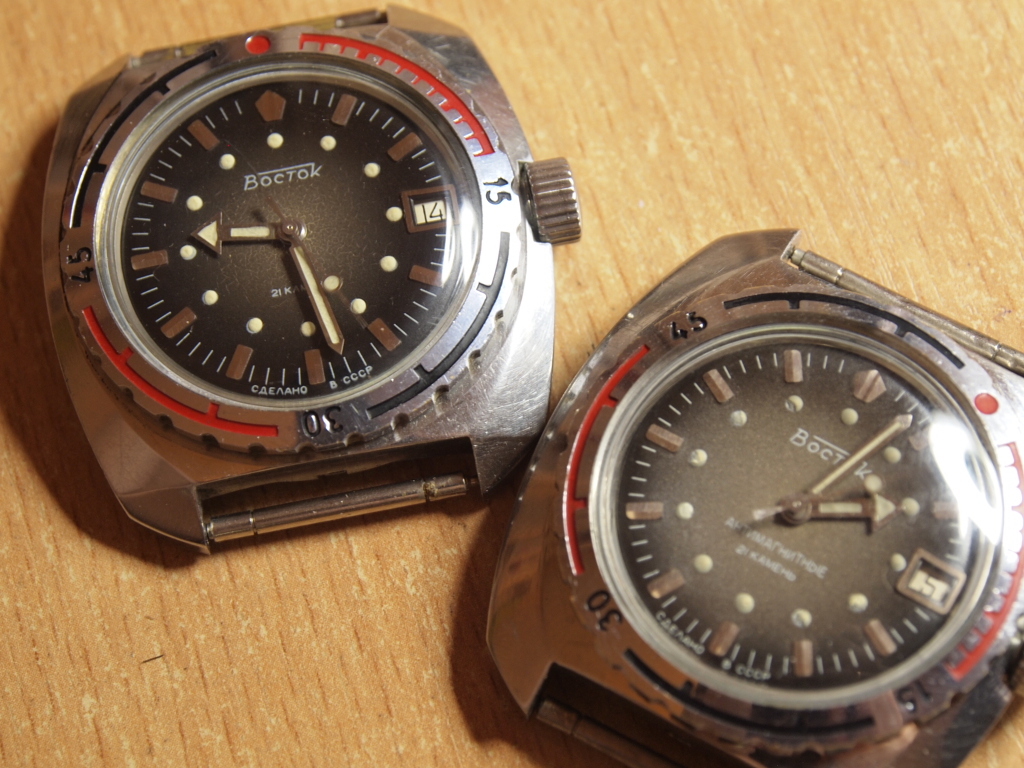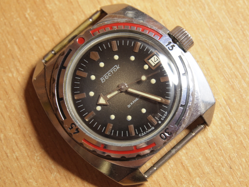 1. Ф-ки, крышка без номера (различные варианты, с логотипом "В". мелкий шрифт, 20 атм.), головка хром. Корпус - квадрат со скосами. Красный календарь.