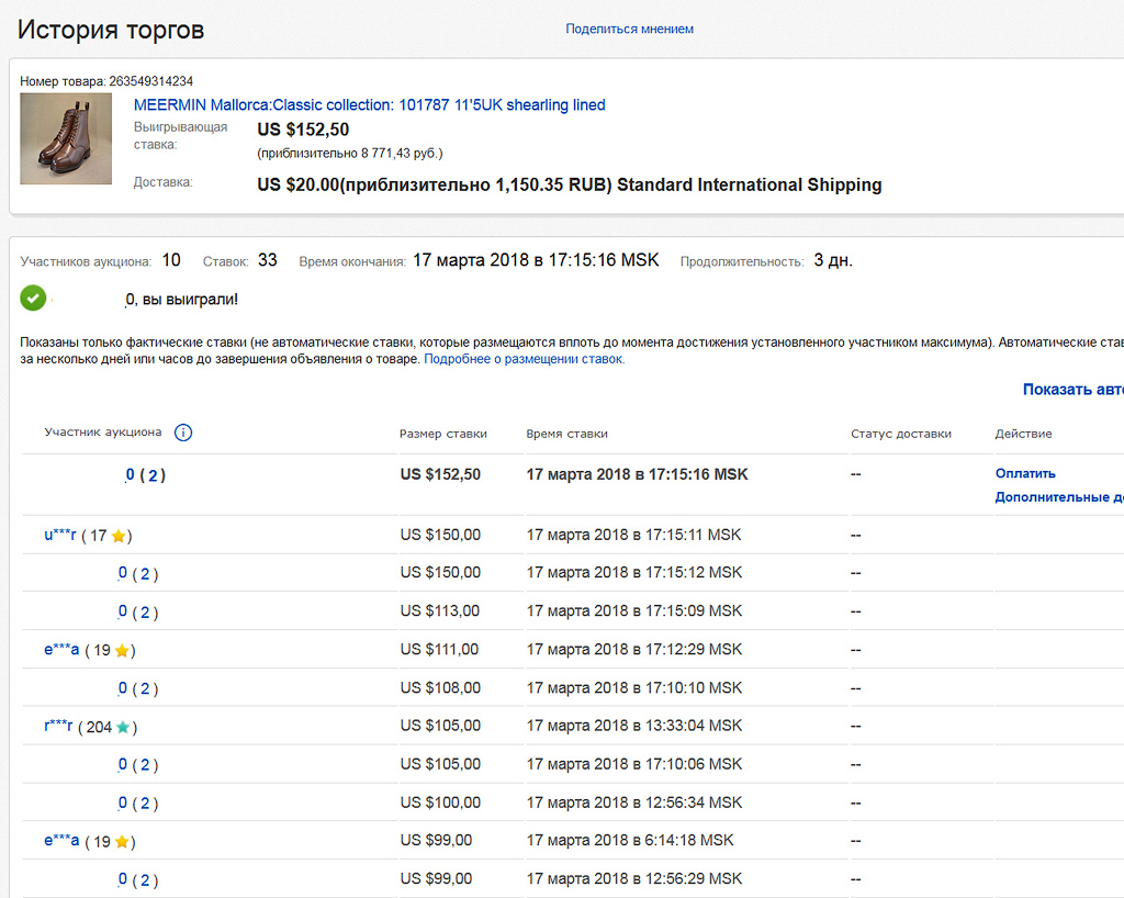Учитывая, что лапти под мои размеры там выкидываются ооочень редко, всё становится совсем грустно. Так что задавил в себе параноика и тоже настроил помощника, установил предельную ставку и стал биться.