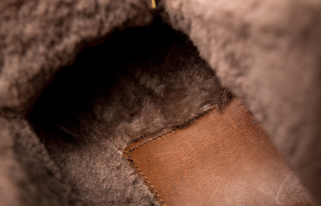Сам мех весьма и весьма качественный. Я привык, что в подкладке зимней обуви бывает либо мягкий и гладкий(скорее всего с примесью синтетики, уж явно не кролика в недорогую обувь засунули), либо достаточно жёсткий натуральный. Здесь по ощущениям некий промежуточный вариант, но в его естественном происхождении вообще не сомневаешься. Держится крепко, выдернуть ничего не получилось.