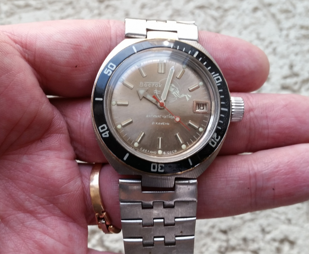 Хотя- очень ровно, без пятен и дефектов, цифер не краской был покрашен( кракелюра нет, да и видно), а видимо- лаком- тонкий, ровный слой равномерный оттенок, видно, что цифер лучеванный. И да, специально вынимал из корпуса и смотрел, по краям цифера и с боков( по краю бортиков)- нет остатков краски того цвета, который остается, если просто выгорает, везде все одинаково. Какие вообще цвета у таких аквалангистов были, кто подскажет?