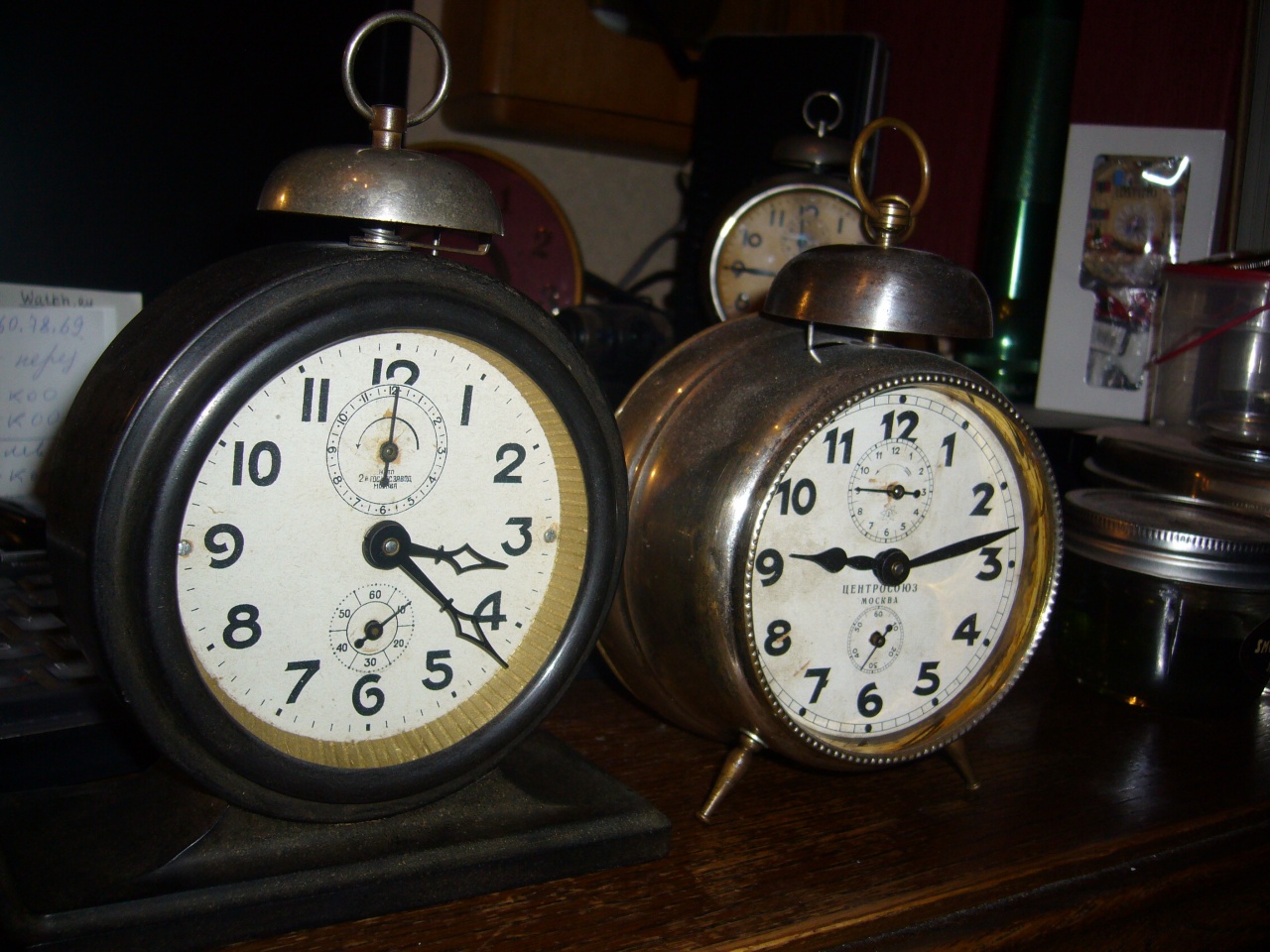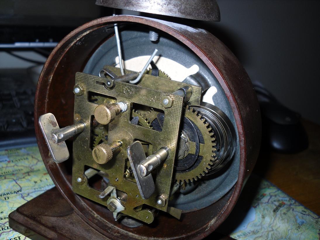 А разве не могло быть так , что звонки и кольца в разное время ставили разные - например , покупали комплектующие у другого часового завода ? Тот второй будильник на Вашем фото ведь тоже советский ? Диаметр звонка на моём экземпляре - 60 мм . И посмотрите , пожалуйста, родной ли тут механизм - в смысле колёсиков , пружинок ? На циферблате тоже дата выпуска , как я понял - Х-50 г. Есть ли ещё экземпляр 50 -го года у кого-нибудь - чтобы определить , родной ли ему звонок или был уже заменён ? Что скажете ?