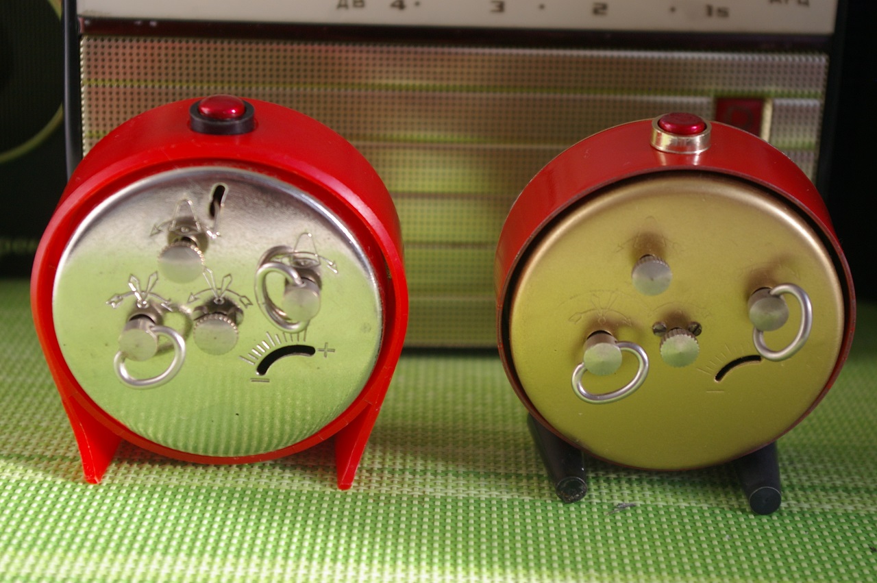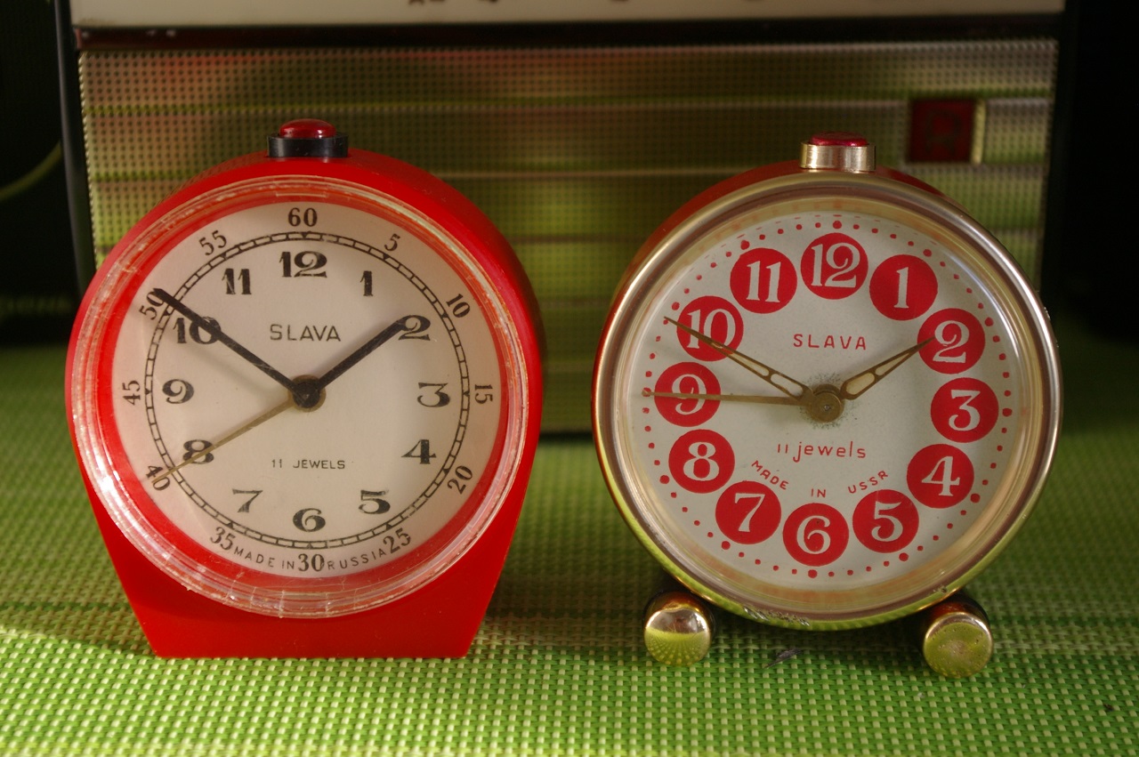 Уважаемые коллеги! Помогите, пожалуйста, разобраться с этими будильниками. Левый 2-65, два правых - не датированы.
