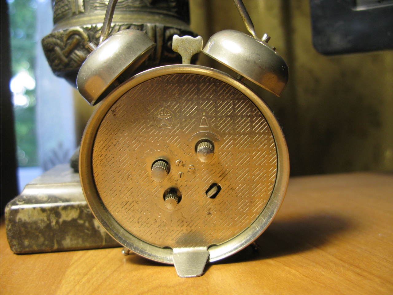 Но не бывает бочки мёда без ложки дёгтя.  Порвана пружина боя, и вместо родных навершия на колокольчиках, втулочки отрезанные от латунной трубочки и просто накручены. Не думаю, чтобы в них нарезали резьбу. Металл мягче стали и так пошёл по резьбе. Навершия я, можно сказать, уже купил у другого продавана омича. Надо ещё пружину добыть и всё будет путём. Мне изначально показалось, что у меня будильник с таким оформлением есть. Но когда его поставил рядом с остальными, сразу бросилось в глаза, что цифири мелкие. Мельче, чем на том, о котором подумал.