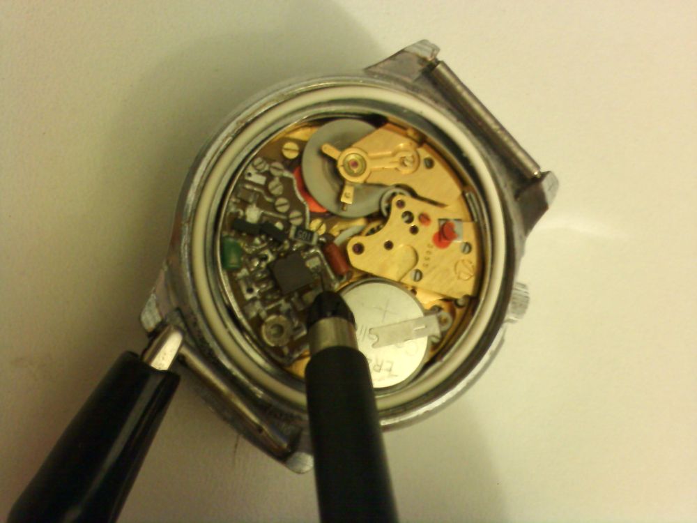 Если вытянуть заводную головку, зацепить крокодил на корпус и щупом прикаснуться к выводу микросхемы (как на фото 2), то на осциллоскопе можно увидеть прямоугольный сигнал с частотой 8 Hz (фото 3). Если теперь задвинуть заводную головку(фото 4), то на экране будет как на фото 5. Ну и как следствие это синусоподобное искажение сигнала возникает из-за взаимодействия катушки с балансом. Ну и прикол собственно в том, что надо добиться того, чтобы синусоподобное искажение сигнала не бежало не вперёд и не назад относительно прямоугольного, а как бы вообще не двигалось относительно него. Добивается это изменением положения градусника. Можно конечно и в двухканальном режиме исследовать(снова крокодил на корпус а второй щуп на сигнальную катушку), ну это уже не так удобно(последние фото).