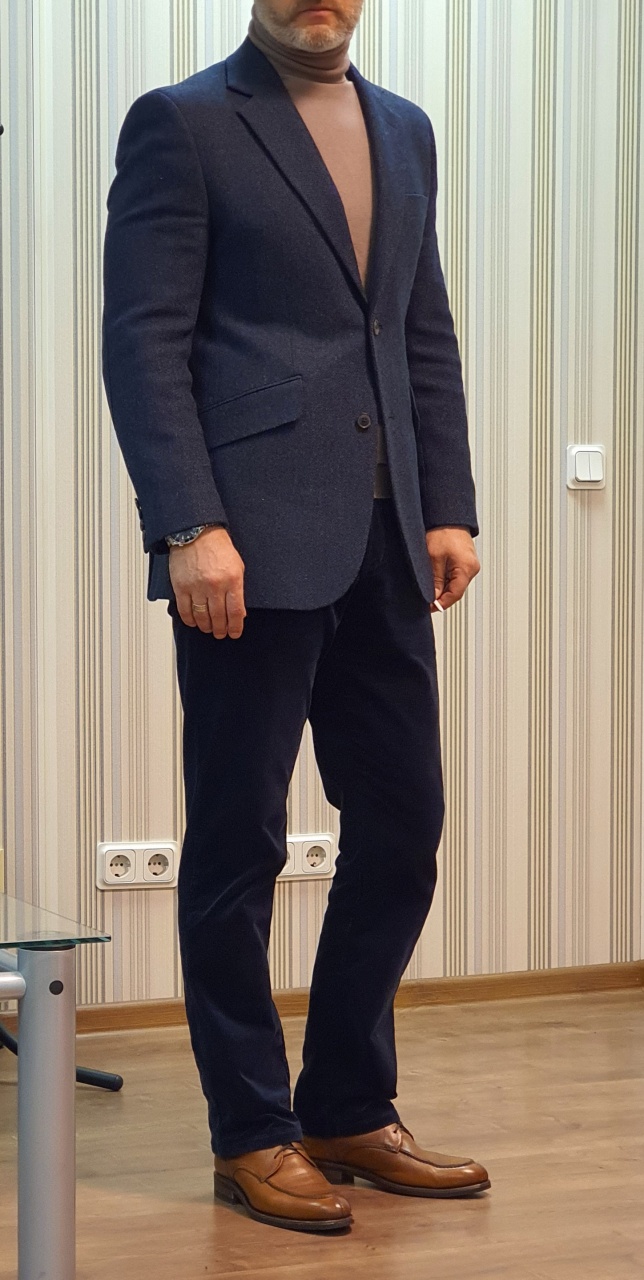 Я бы не назвал это луком. Скорее -вид. Сидит на троечку. Синее на синее - плохо. Сама подача унылая, несмотря на живой яркий ореховый цвет ботинок и бадлона. Я бы не стал молодится с таким узким кроем брюк, взял бы более прямые и посвободнее.
