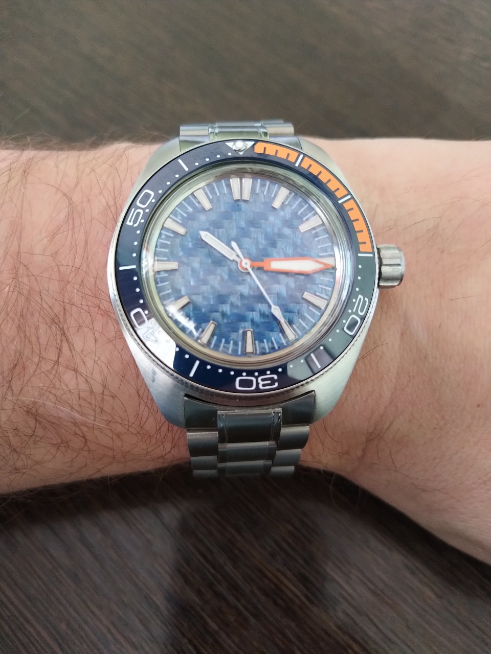 Корпус 020, безель от arkustime, вставка керамическая для сейко, стрелки и браслет с ебей, циферблат самодельный из карбона на востоковской подложке, механизм 2416Б с полностью снятым календарем