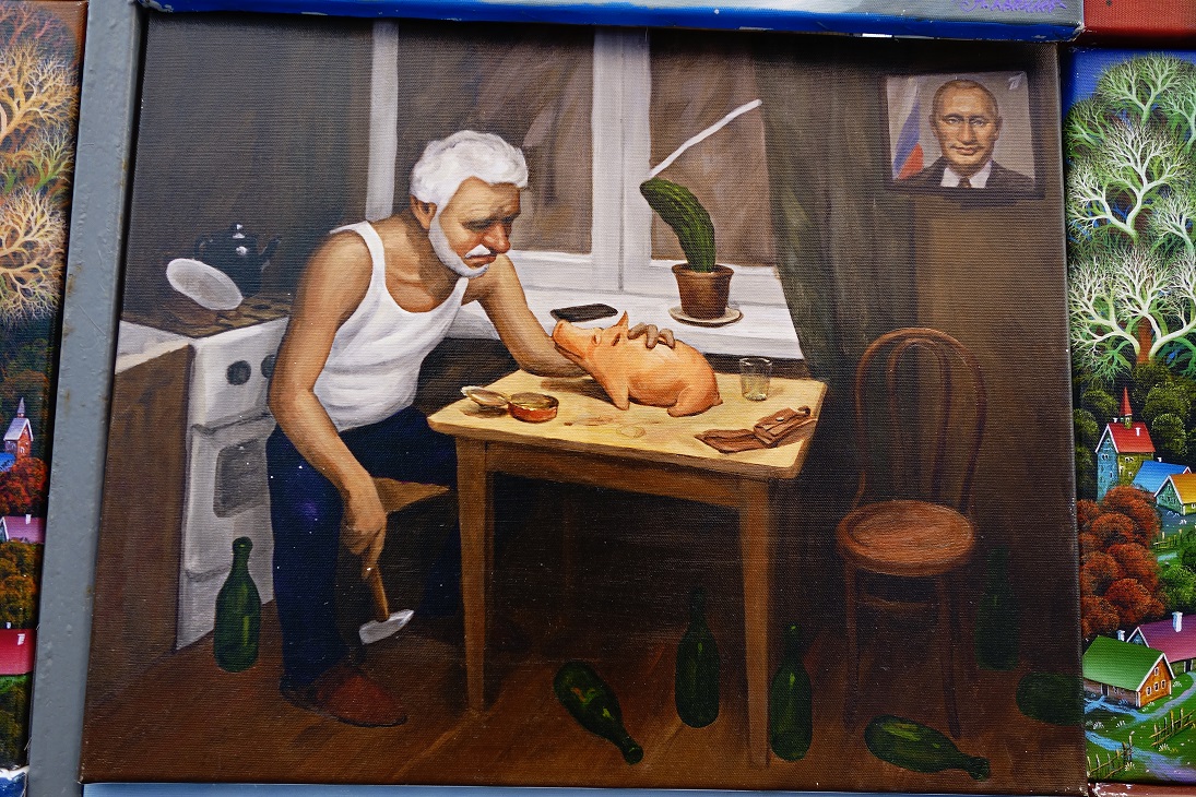 Я пошел поглазеть на творения современных свободных художников. Они теперь в таких типа навесах на набережной, а не как раньше просто на травке. Ну такое. Незаконченное художественное есть, могу судить. Под Рене Грюо закос в московских антуражах понравился одного автора. И Чебурашка другого, прям как живой. Однако, не лубок. Был бы лубок, купил бы 100, Чебу, в лубке рисовать надо.