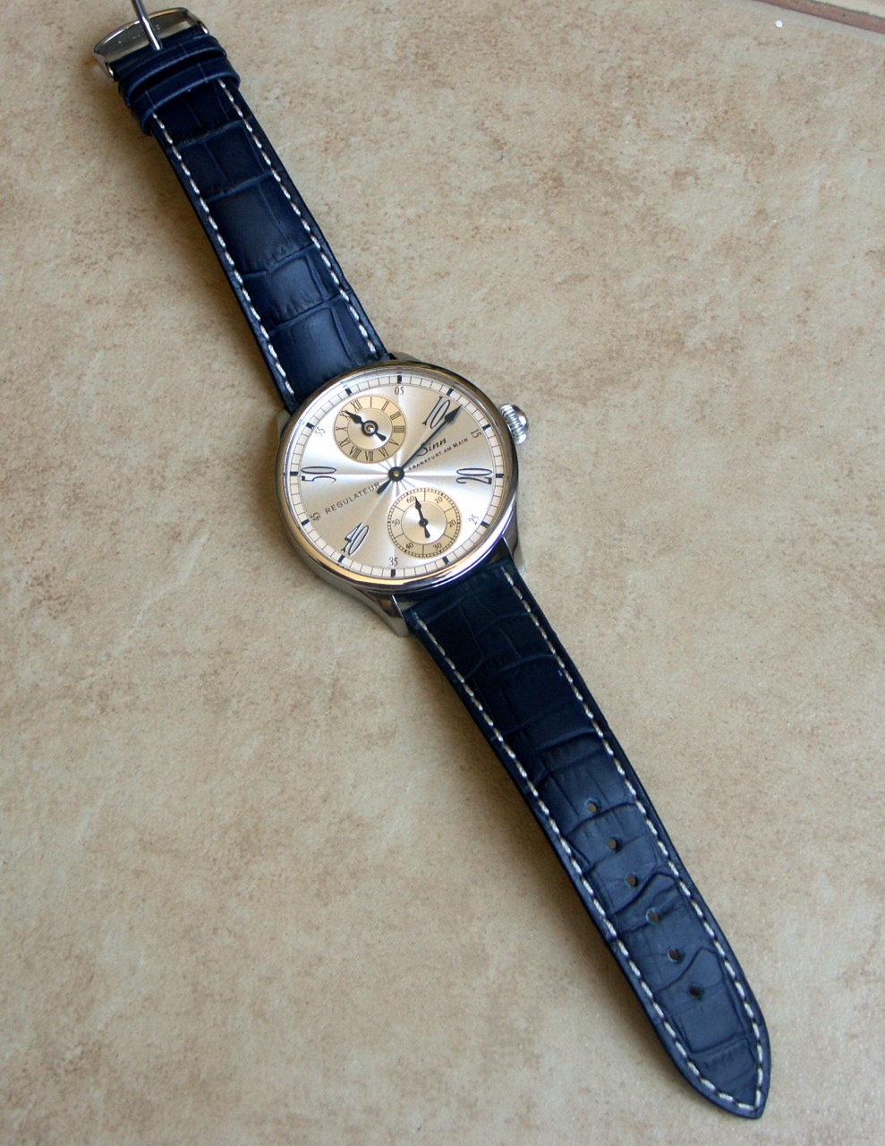 Душа тайно поскуливала по маринеурам, посему решил, что дезигн будет именно такой: синие стрелки, синие цифры, синий ремешок. Остальное, включая меня, все не синее. Sinn, стало быть.