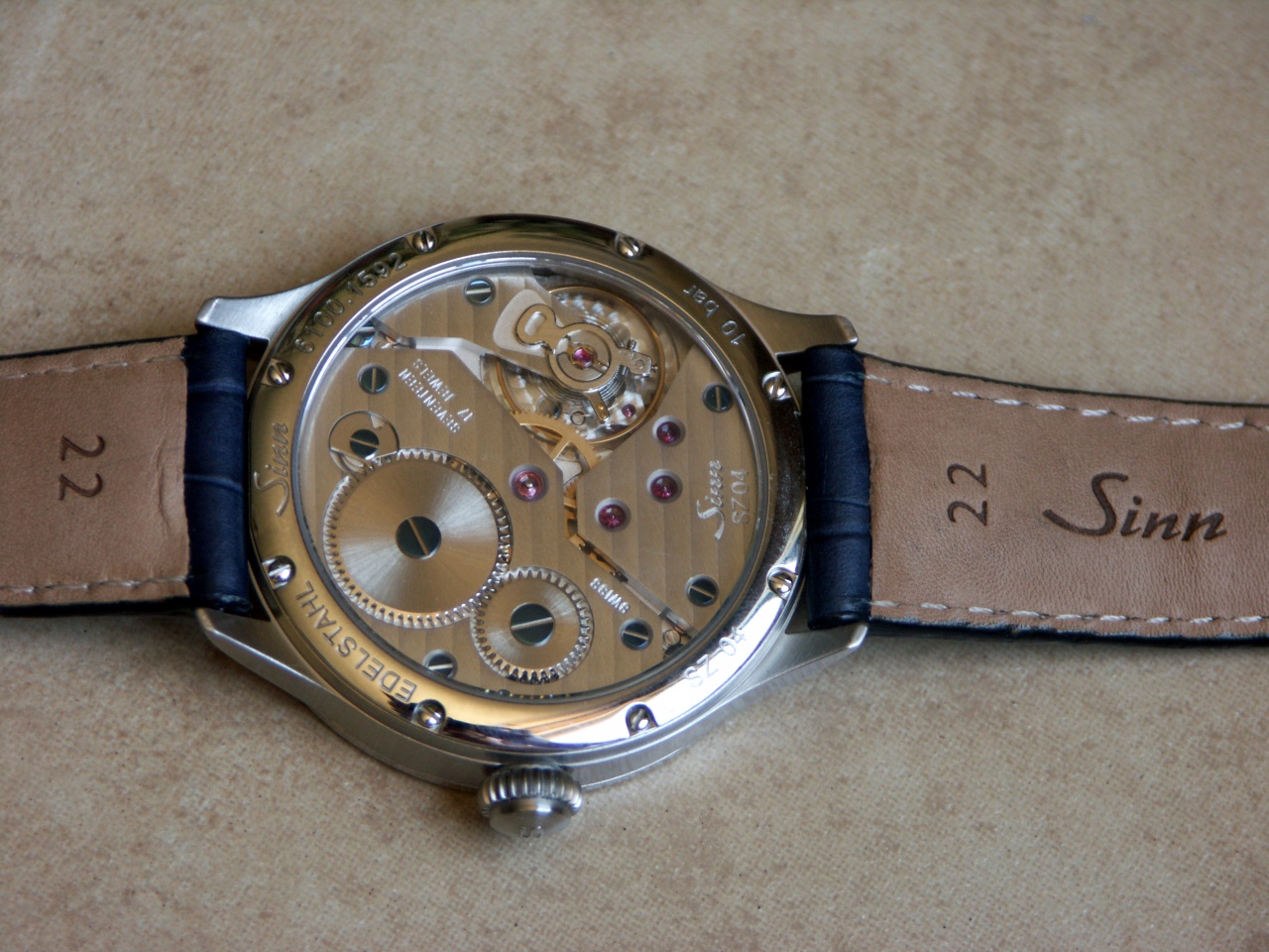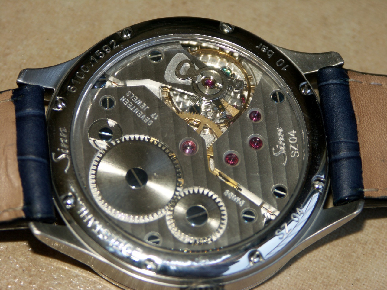 Царапкой надпись «SINN SZ04». Это существенное улучшение. Герр Гюнтер, если мне не изменяет память, в аналогичный механизм вносил похожие изменения: писал золотом «Штайнхарт», прикручивал шею, винтовой баланс, полировал кругами. Но если бы он назвал это дело «мануфактурой», его тут же утыкали бы отравленными писюнами за то, что он «теперь совсем обнаглел, и уже механизмы хоммажит».