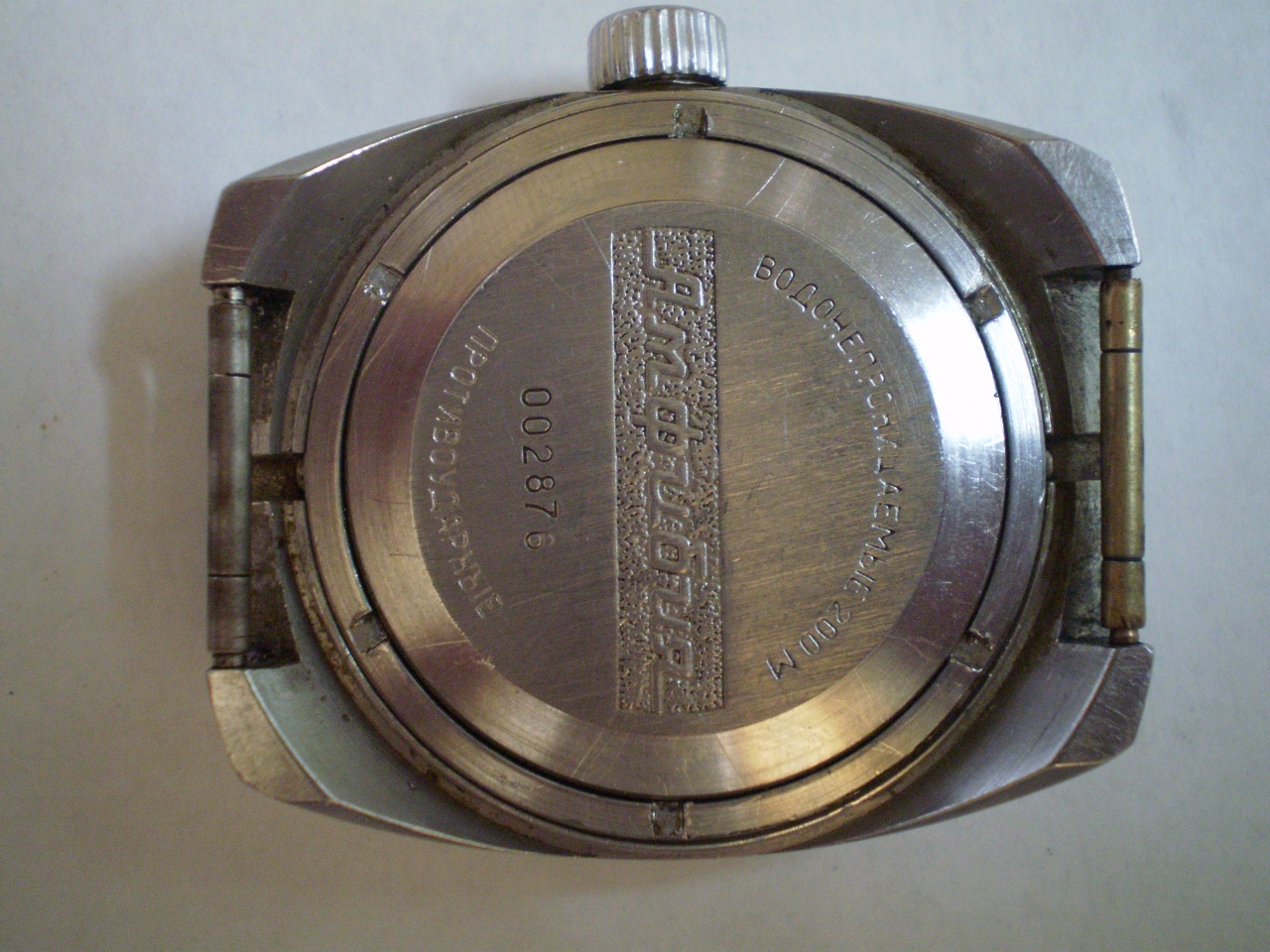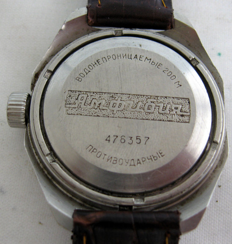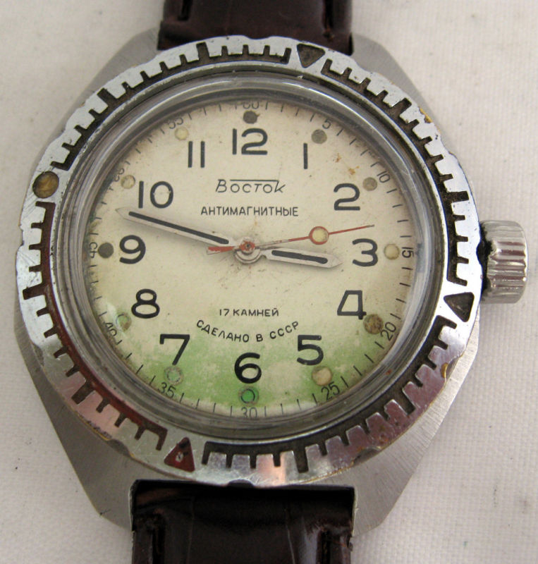 Долго я просил своего мастера найти мне поворотное кольцо для старой Амфибии, он обещал принести, но как-то все тянул время и не мог принести. На днях я зашел к нему и спросил про кольцо, он порылся в ящике, вытащил часы и собрался снимать кольцо. Часы были без головки, мастер оставил их на разбор, как он сказал, валялись в ящике уже лет пятнадцать. Что-то мне в них понравилось, возможно, насыщенный синий цвет циферблата или ф-образная часовая стрелка. Я решил часы купить, жалко стало оставлять их на растерзание.