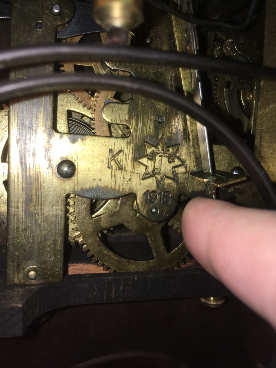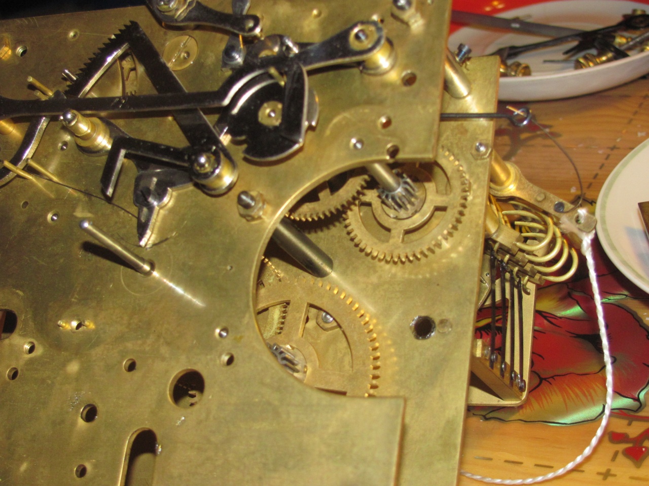 Но наиболее интересен здесь механизм боя. Во-первых, привод запуска боя часов от боя четвертей осуществляется не через один рычаг, а через два: рычаг стопорения боя при подготовке (двуплечий наверху механизма) и основной рычаг стопорения приводятся независимо. Последний поднимается длинным горизонтальным рычагом, похожим на знак вопроса. Вообще, механизм часового боя довольно архаичен: нет ни устройства, позволяющего часам ходить при незаведённом бое и опустившейся гребёнке, ни кулачка на "черпале", приподнимающего рычаг в момент подъёма гребёнки, в результате чего слышно пощёлкивание. Самоустановка четвертного боя осуществляется следующим образом: прорезь на счётном колесе, куда попадает рычаг после отбивания 3/4, глубже других. При этом тяга наверху механизма (с овальным отверстием) опускает подпружиненный верхний изогнутый рычаг, который цепляет за штифт на колесе своим крючком. Если минутная стрелка показывает на 3, 6 или 9, высоты подъёма тяги не хватает для подъёма упомянутого рычага - он удерживается за счёт трения, поэтому угол наклона рабочей поверхности его крючка, как и усилие пружинки этого рычага, должны быть тщательно подобраны. И только если стрелка подходит к 12, нижняя кромка овального отверстия в тяге поднимает этот рычаг и бой 4/4 сработает. Полезная, но редко встречающаяся в те голы функция – отключение боя с помощью шнурков, которые надо зацеплять за крючочки в корпусе.