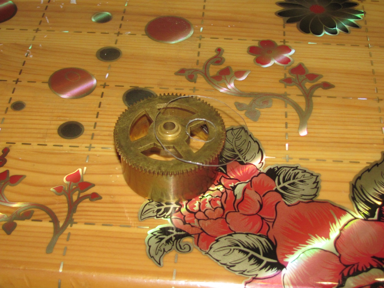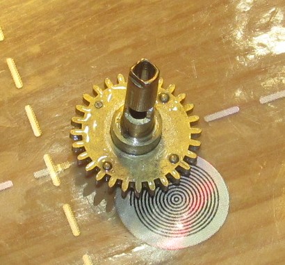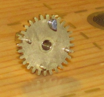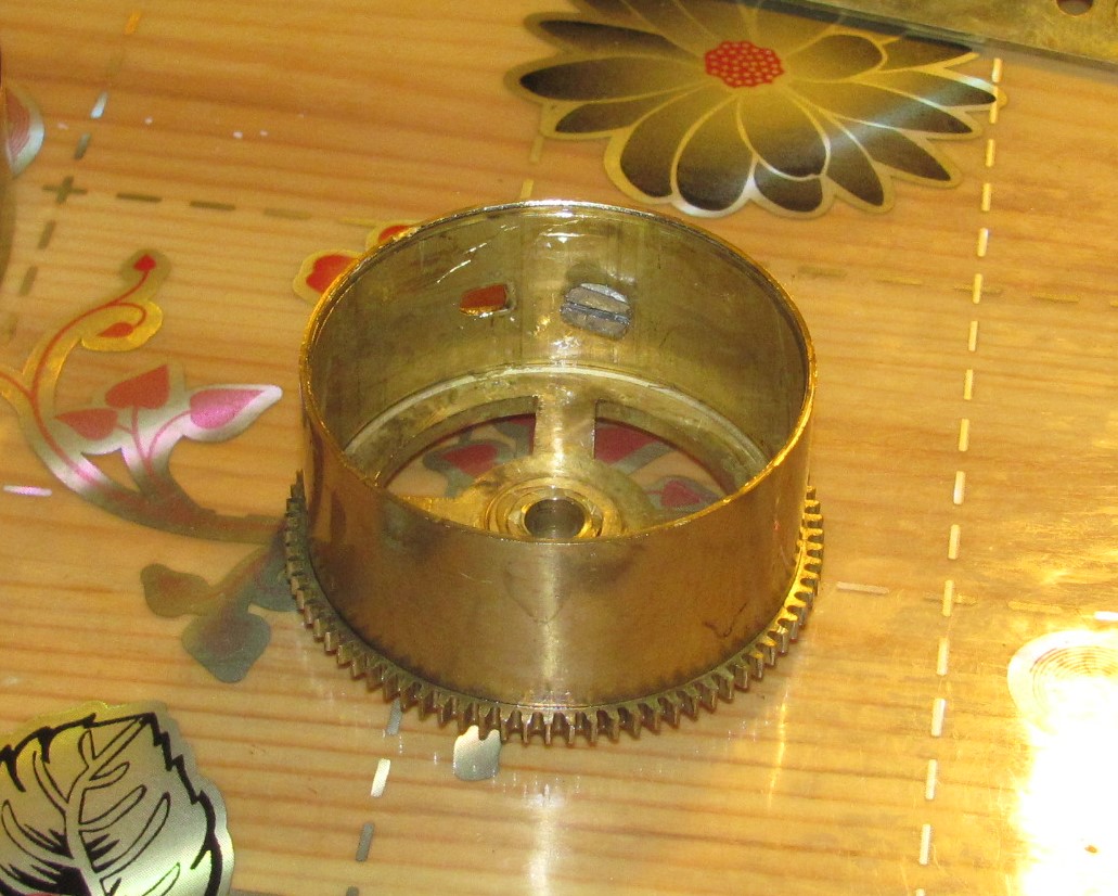 Теперь, собственно, из-за чего часы ко мне попали. Часовая стрелка «упала», вскрытие показало отсутствие одного из зубьев триба вексельного колеса. Зубья на часовом колесе уже до меня ремонтировались. Видимо, когда-то с силой провернули стрелку при незаведённом бое и опустившейся гребенке. Поразмыслив, решил я делать новый триб из триба от ангренажа будильника «Витязь». Всё получилось, но с натягом в колесе я ошибся и пришлось прибегнуть к пайке. Зазор в зацеплении с часовым колесом увеличился, но у этого механизма мост вексельного колеса сидит на своей колонке и зазор можно регулировать поворотом моста. Стрелочный механизм заработал, но заедал из-за того, что один из самодельных зубьев часового колеса был толще – пришлось поработать надфилем. Вообще, механизм этот ремонтировался уже многократно (есть несколько очень аккуратно поставленных футоров, в одном из барабанов крючок самодельный), но не всегда квалифицированно. Вышеупомянутый механизм самоустановки четвертного боя не работал в принципе. Тот, кто до меня в нём ковырялся, не смог понять принципа его работы, стал гнуть штифт на верхнем рычаге с крючком, расшатал его, кое-как припаял, расшатал уже пайку, также он принялся пилить крючок несчастного рычага… В общем, пришлось устранять всё это безобразие. В довершение всего сломалась пружинка заводного храповичка боя часов – пришлось делать новую.