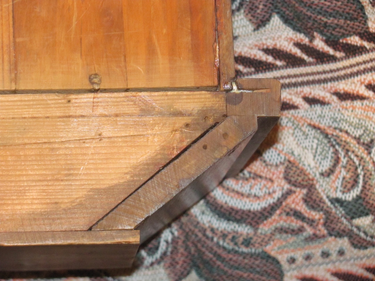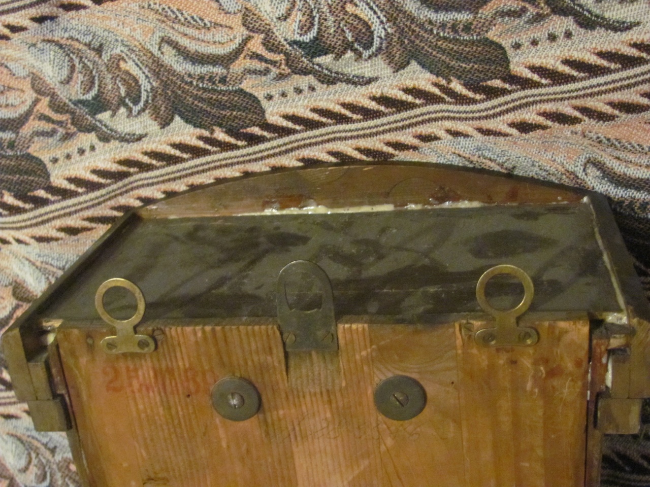 Корпус красивый, явно прошёл серьёзную реставрацию, судя по свежему внешнему виду и следам явно современного клея. Проушины с винтами, предотвращающими самопроизвольный наклон часов, не сохранились, поэтому я просто наклеил кусочки резины, как на современных часах. А вот зачем нужны две дополнительные проушины сверху корпуса – я так и не понял.