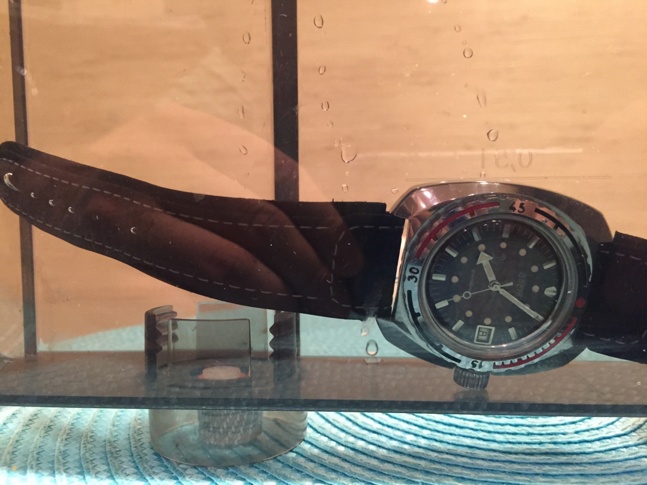 Потом не удержался и себе такой же, но синий прикупил на свою синюю Amfibia Reef ремешок. Тоже где только не был - кроме бани и бассейна с хлоркой. Бывало от пота и пыли темнела прострочка на ремешке, так зубная щётка и мыло в два счёта возвращают первозданную белизну. Вот из последнего:
