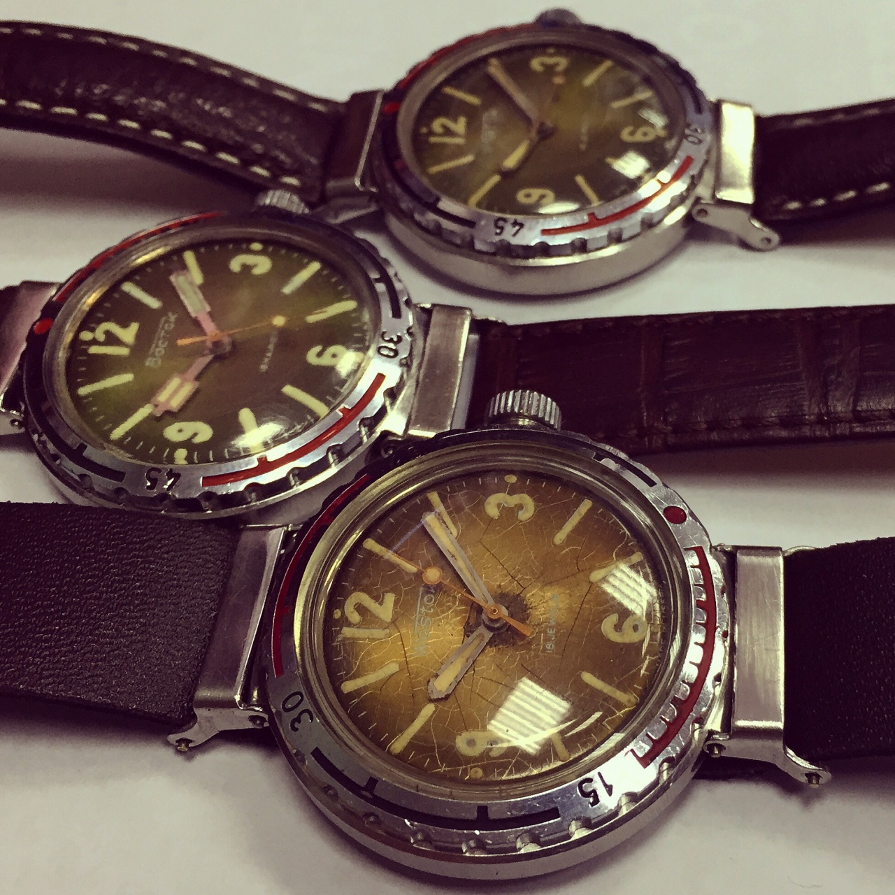 По вопросу 2. Если Вы интересуетесь о советских ушастых амфибиях (350 корпус), то был на них черный безель из алюминия, наверное на самых ранних, очень редкий и вроде как ставился не на такие часы ( вернее циферблат), а на "зубастые" ушастые амфибии на циферблате метки - треугольники.