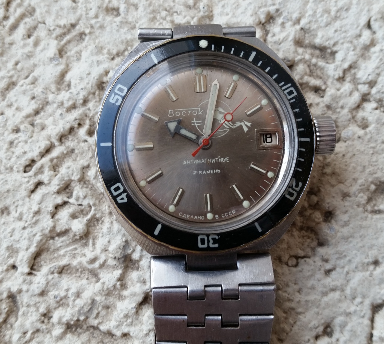 Хотя- очень ровно, без пятен и дефектов, цифер не краской был покрашен( кракелюра нет, да и видно), а видимо- лаком- тонкий, ровный слой равномерный оттенок, видно, что цифер лучеванный. И да, специально вынимал из корпуса и смотрел, по краям цифера и с боков( по краю бортиков)- нет остатков краски того цвета, который остается, если просто выгорает, везде все одинаково. Какие вообще цвета у таких аквалангистов были, кто подскажет?