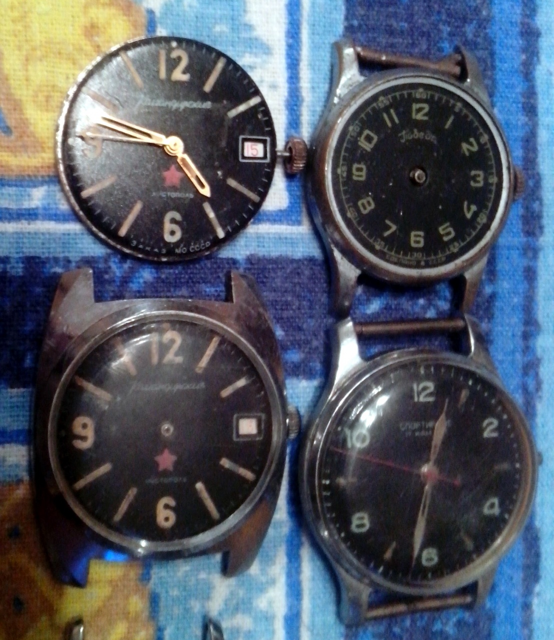 Это еще не все, не фотографировал пока кучку часов без стекол и стрелок с неопознаваемыми убитыми циферами, отдельно есть еще циферы, почему-то много Востока с нижней секундой (на 6 часов) малого диаметра. Это потом. Все фото залью в альбом отдельный себе, ссылку дам, смотрите, может что пригодится. И качество фото получше сделаю.