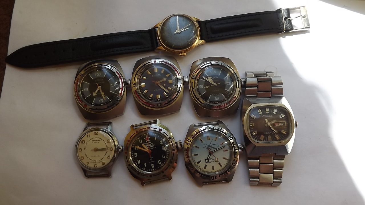 56шт.: Maurice Lacroix, Epos, Bulova, Seiko, Orient (3), Citizen, Armani, Океан, Авиатор, Полет (3), Родина, Спутник, Урал, Восток (6), Ракета (13), Слава (4), Чайка (3), ЗиМ, Победа, Заря (2), Луч, Дружба, Молния и тд... Два года скромного хобби
