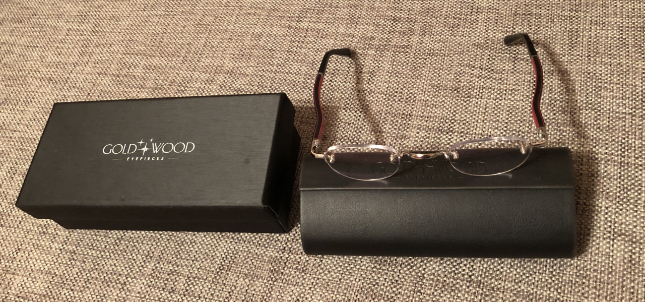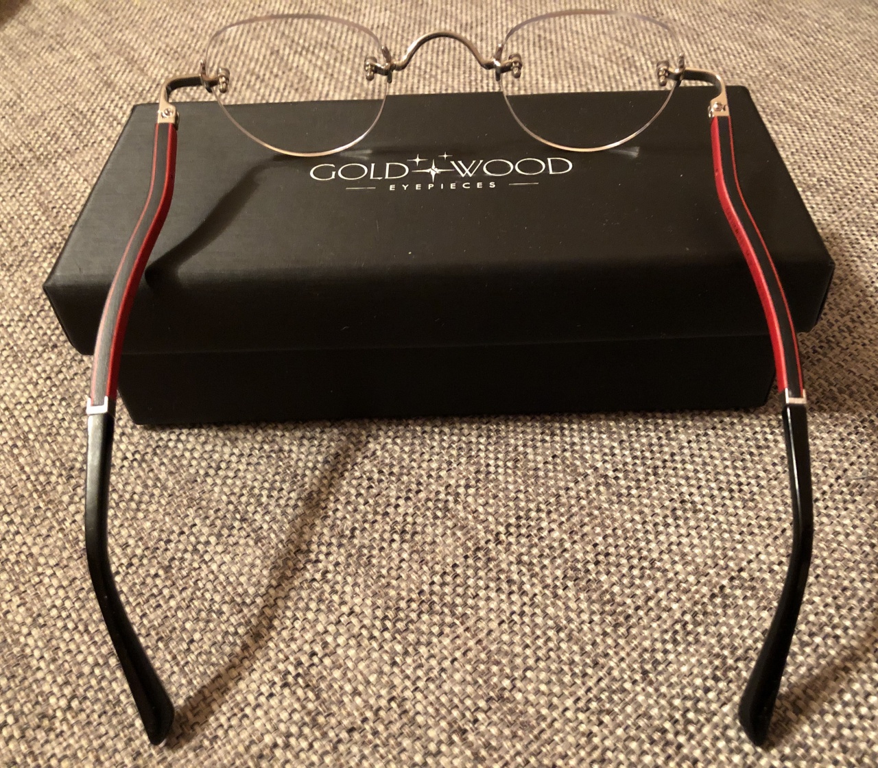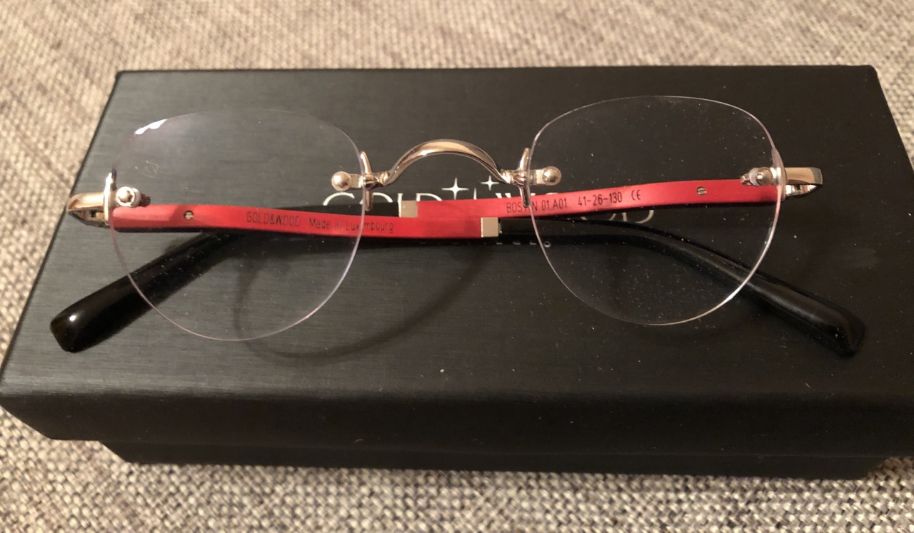 Вторыми в моем сборище чисто оптическими очками стали Gold Wood Boston за необычную форму дужек, кстати, довольно удобную, и шизоидный красный цвет их внутренней на две трети деревянной части: