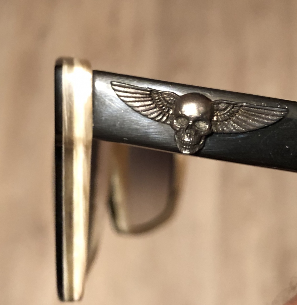 Но, когда начинаешь к ним присматриваться, то тебя покоряет костяной цвет внутренней части очков, материал - рог, устройство крепления дужек, позволяющее их чуток раздвигать в ширь друг от друга, очень мягкий костяного цвета чехол с замшей внутри, сертификат оригинальности, буклет, и, разрушающие патетику, маленькие серебряные черепа на дужках. Одеваешь их - как влитые, при первом взгляде на лицо в очках - ничего примечательного, но глаз требует вернуться к изучению, начинает раскрываться второй и третий смысловые ряды.