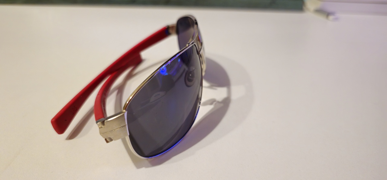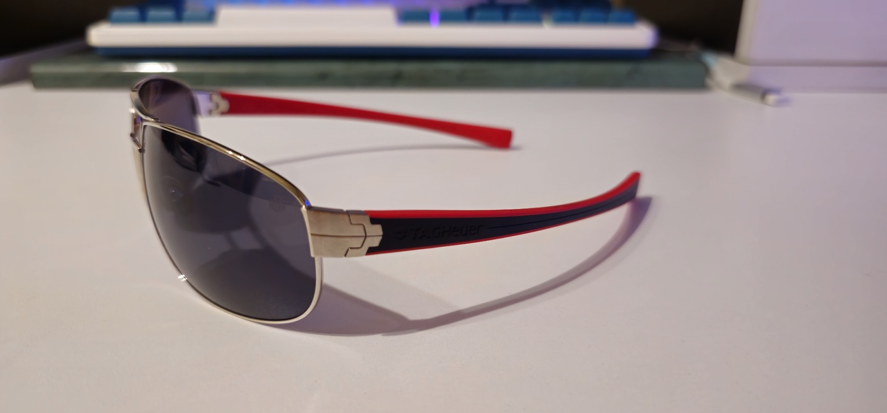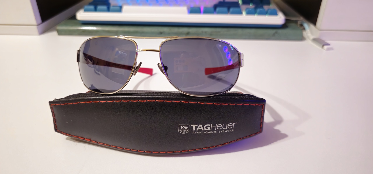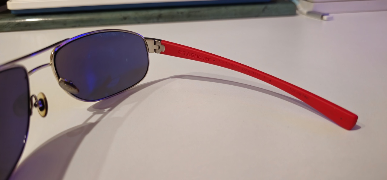Tag Heuer 0252 102. С них все началось, были подарены мамой около 5 лет назад. Из интересного: бренд из мира часов, перекликается с вторым увлечением; красно-черный цвет, не слишком часто используется в дизайне оправ; петли в виде звеньев браслета модели часов Tag Heuer Link; серо-синяя линза, облегающий силуэт, хорошо подходят для достаточно солнечных дней.
