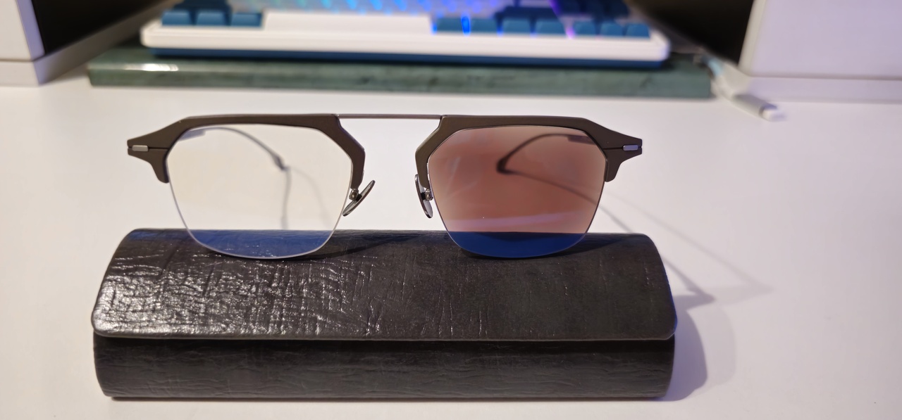 Boss 1136 YZ4. Одни из двух повседневных пар. Из интересного: хороший представитель модели от fashion бренда - титановые дужки и носоупоры; полуоправная конструкция, верхняя часть рамки из алюминия(редкий материал для очков); маленькие лого бренда; сама форма линзы необычная, вариация навигаторов; стоят фотохромы Zeiss Photofusion X Brown + Flash Mirror Blue.