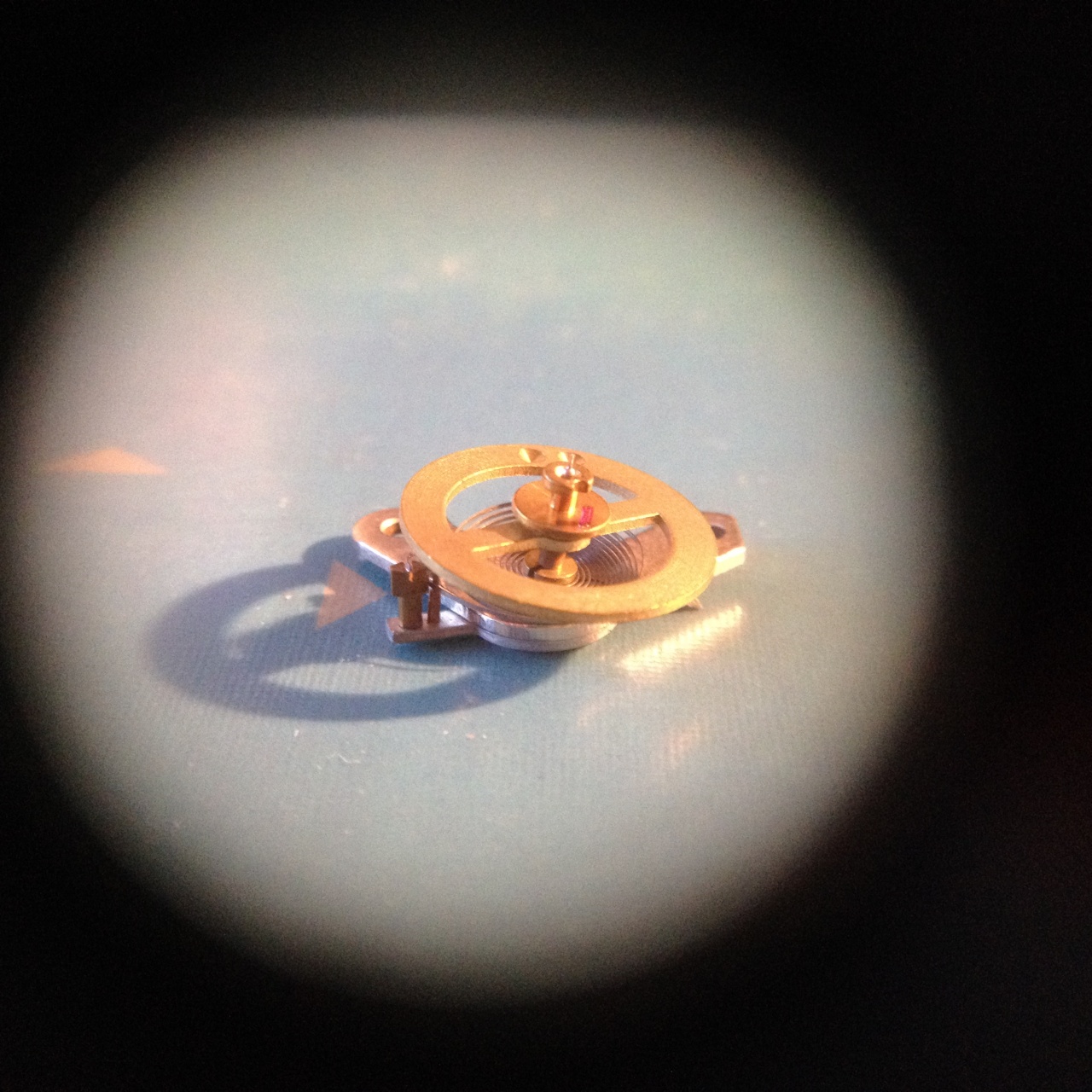 Но часы все равно не идут, т.к пружинка у баланса не закреплена. Да и пружинка уже короткая, выкачка не по центру и камень этот может выпасть, я так думаю.